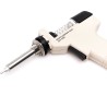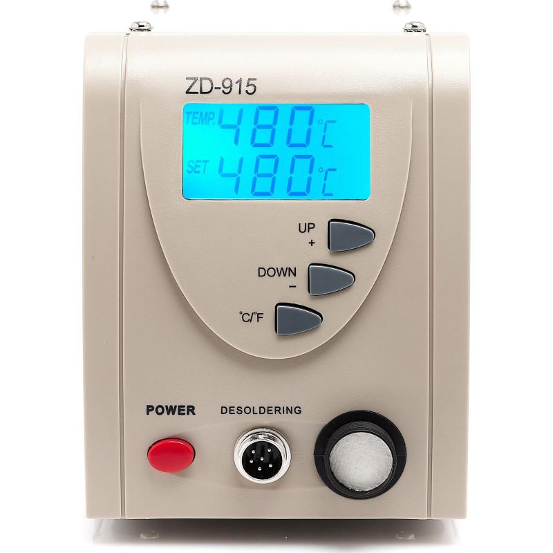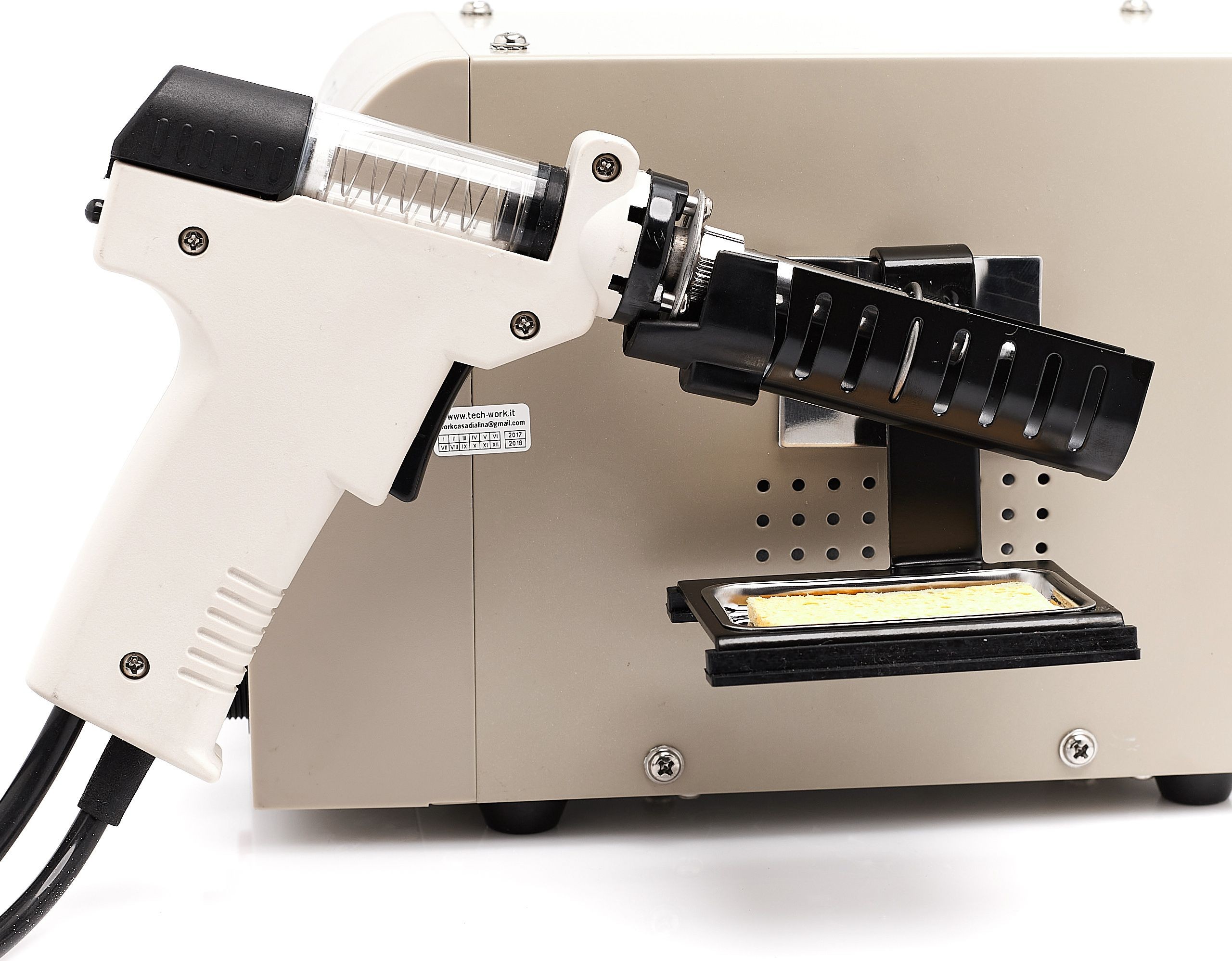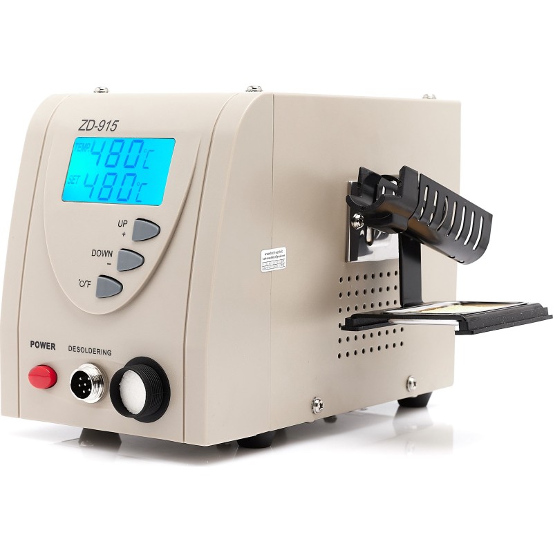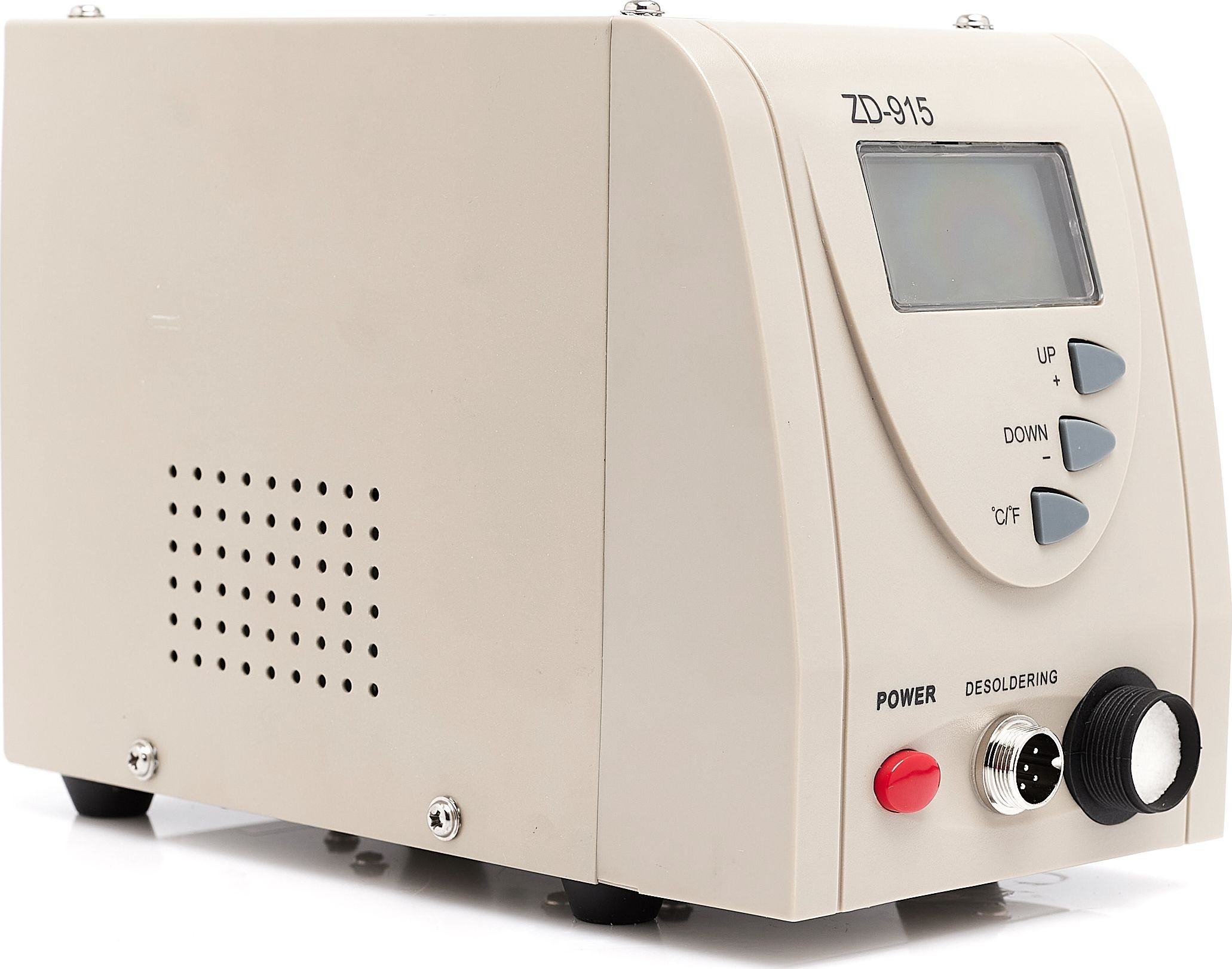 Lötstation zum Entfernen elektronischer Bauteile von Leiterplatten (PCB). Die Station verfügt über einen eingebauten Kompressor, der beim Betätigen des Pistolenabzugs startet und einen Unterdruck erzeugt. Im Vergleich zu herkömmlichen Absauggeräten ist sie komfortabler und ermöglicht ein schnelleres Arbeiten – sie erhitzt das Zinn selbst. Die Zentraleinheit ist mit einem großen und gut lesbaren LCD-Display mit Hintergrundbeleuchtung ausgestattet, das den eingestellten Temperaturwert sowie die am Lötspitzenmessfühler gemessene (abgelesene) Temperatur anzeigt. Die Temperatur ist in Schritten von 1 °C im Bereich von 160 °C bis 480 °C einstellbar. Das leistungsstarke 90-W-Heizelement bewältigt viele schwierige Fälle.