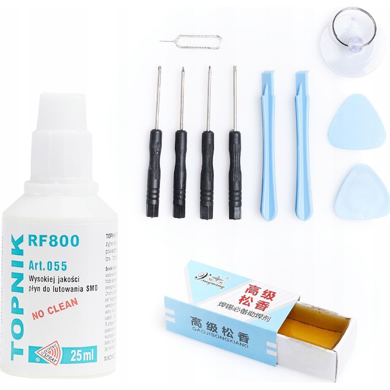 In diesem Set erhalten Sie das notwendige Zubehör zum Löten. Sie erhalten ein Set mit 10 Werkzeugen, Kolophonium und dem Flussmittel RF800.