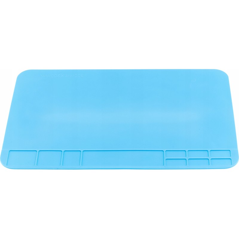 Hochwertige Silikonmatte mit geformten Fächern, die den Arbeitskomfort in jeder Werkstatt verbessert. Die antistatischen Eigenschaften und die speziellen Fächer ermöglichen die Organisation und Sortierung von elektronischen Bauteilen, Schrauben usw. während der Arbeit. Die große, flache Oberfläche und die hohe Temperaturbeständigkeit ermöglichen das Löten von Platinen und Bildschirmen direkt auf der Matte. Die Matte ist beständig gegen sehr hohe Temperaturen bis zu 500 °C und ermöglicht das Löten direkt auf der Matte. Sie ist mit mehreren verschiedenen Fächern ausgestattet, in denen z. B. Schraubendreher, Schrauben, Flussmittel, Zinn und andere kleine, im Servicebereich verwendete Teile untergebracht werden können. Sie eignet sich ideal für Werkstätten, die sich mit der Reparatur von Mobiltelefonen, Tablets und Computern befassen, sowie für andere Bereiche, in denen eine hochwertige, hochtemperaturbeständige Antistatikmatte benötigt wird. Die Matte kann mit Wasser, Isopropylalkohol oder einer anderen Reinigungsflüssigkeit für Leiterplatten gereinigt werden. Die Matte ist mit Organizerfächern ausgestattet, die es ermöglichen, den Arbeitsplatz perfekt in Ordnung zu halten – alle Schrauben und andere Metallteile befinden sich an einem Ort.