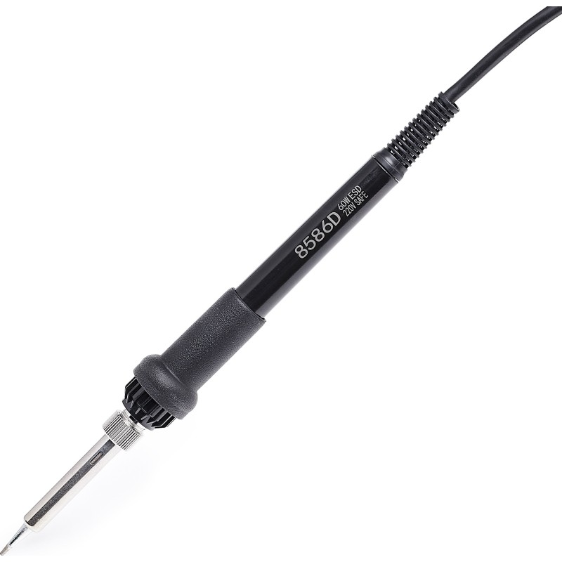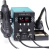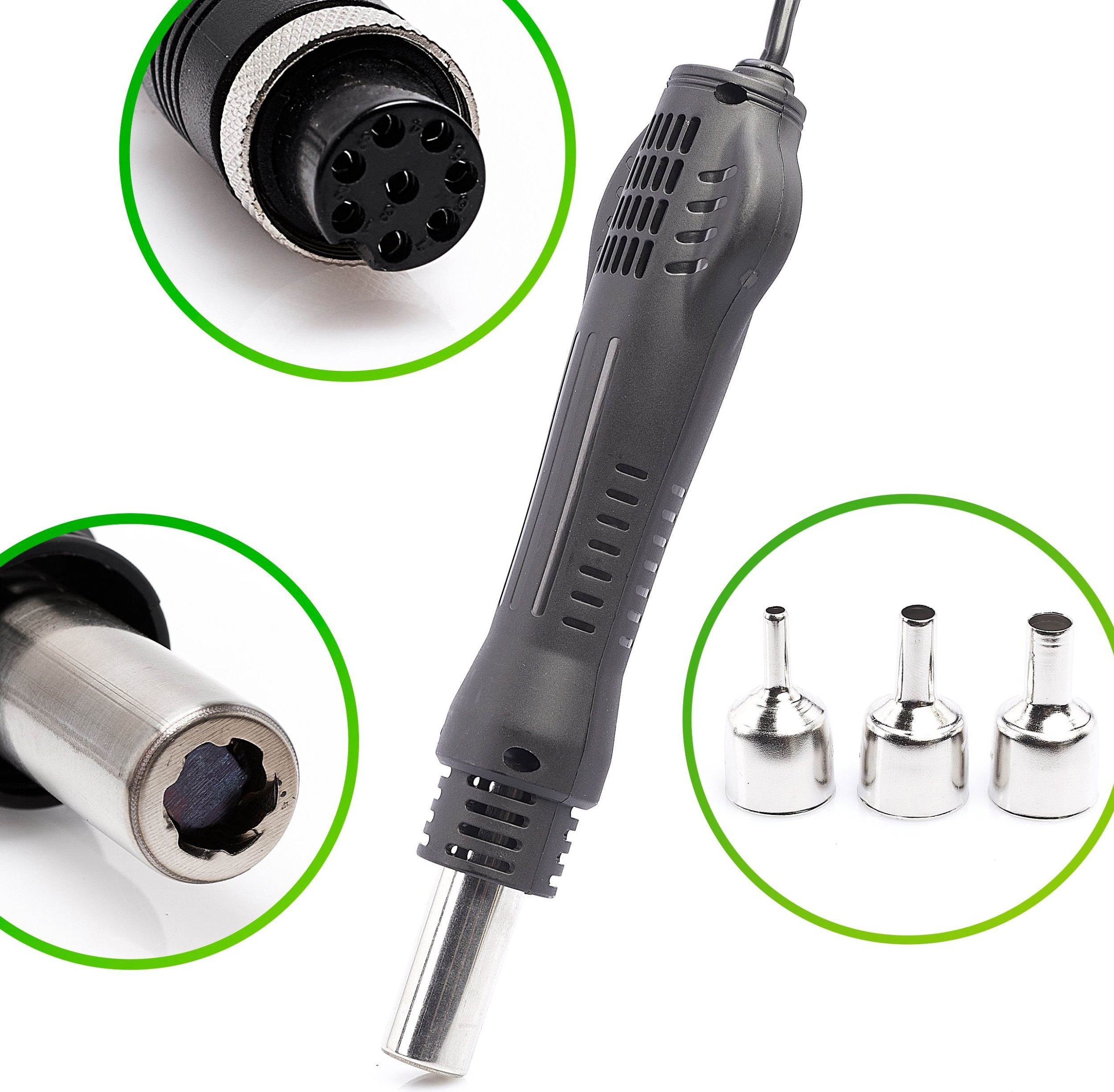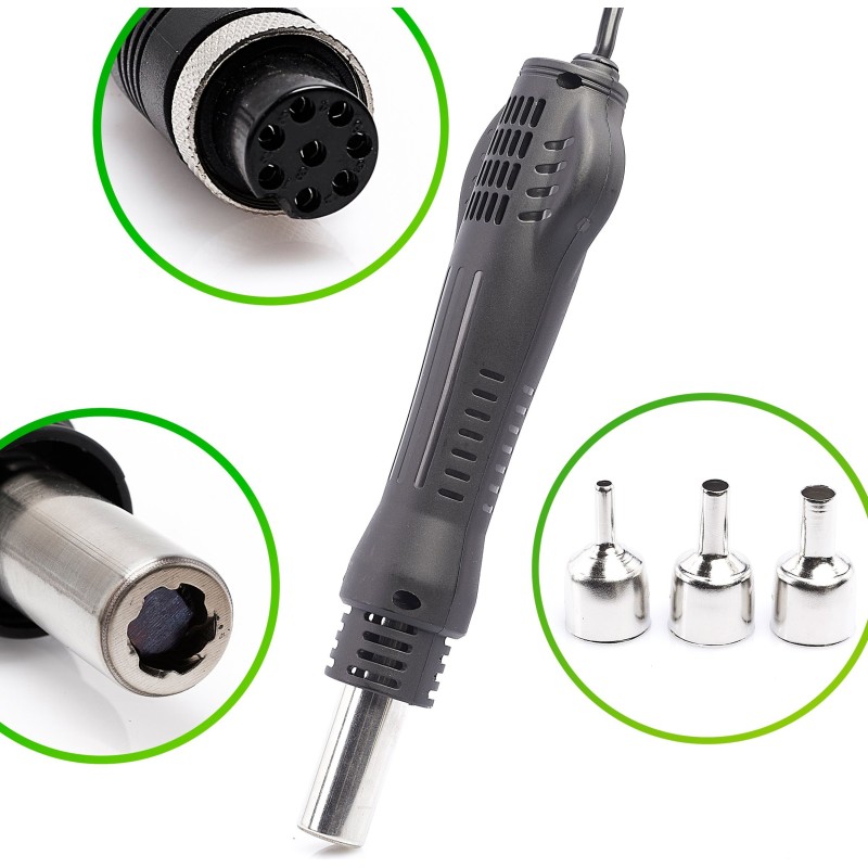 Beide Module der Station – Lötkolben und Heißluft – können unabhängig voneinander betrieben werden (die Station verfügt über ein Display, das die Temperatur nur eines Moduls anzeigt, aber man kann mit der SET-Taste frei zwischen ihnen umschalten). Die Station ist außerdem mit einem automatischen Abkühlsystem nach Beendigung des Betriebs ausgestattet. Dadurch erhöht sich die Lebensdauer des Heizelements. Dank der hohen Leistung von 60 W und der schnellen Aufheizgeschwindigkeit eignet sich der Lötkolben nicht nur für das herkömmliche Löten, sondern auch für das bleifreie Löten (Lead Free). Die Luft wird durch einen Lüfter geblasen, was einen langlebigen und zuverlässigen Betrieb mit stabiler Blasleistung sowie einen leisen Betrieb garantiert. Der Griff der Station ist klein und komfortabel in der Handhabung, und die Station ist mit über 30 Spitzenmodellen kompatibel.