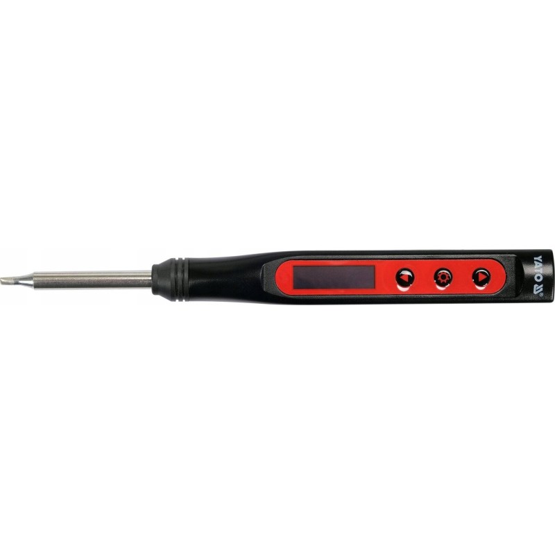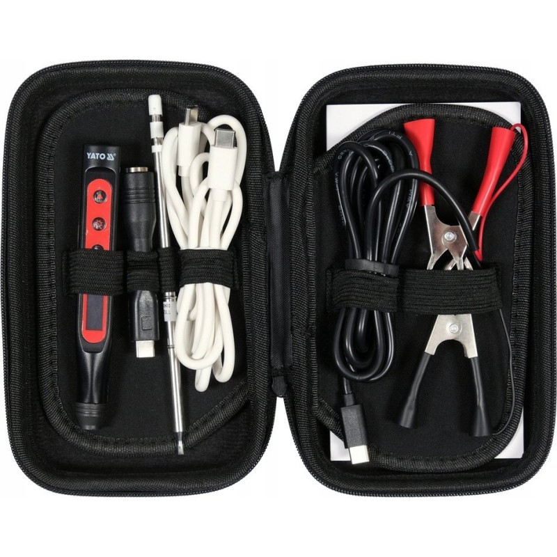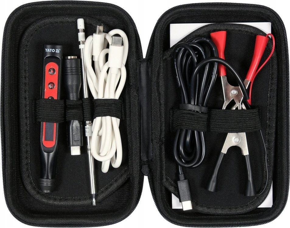 Tragbarer digitaler Lötkolben für T-12-Spitzen, der über einen USB-C-Anschluss mit Strom versorgt wird. T12-Spitzen bestehen aus einer Kombination aus einem in Keramik eingebetteten Widerstandsdraht, einem Temperatursensor und einer hochwertigen Lötspitze. Die integrierte Konstruktion der Spitze ermöglicht ein schnelles Aufheizen und eine sehr schnelle Temperaturstabilisierung. Der Lötkolben funktioniert mit jeder Stromquelle mit einer Spannung von 9 bis 24 V und einer Stromstärke von über 1,5 A. Dies können sowohl Schnellladegeräte für Mobiltelefone, Laptop-Netzteile, Powerbanks mit QC- oder PD-Anschlüssen, Li-Ion-Akkus, bestimmte YATO-Reiseadapter usw. sein.