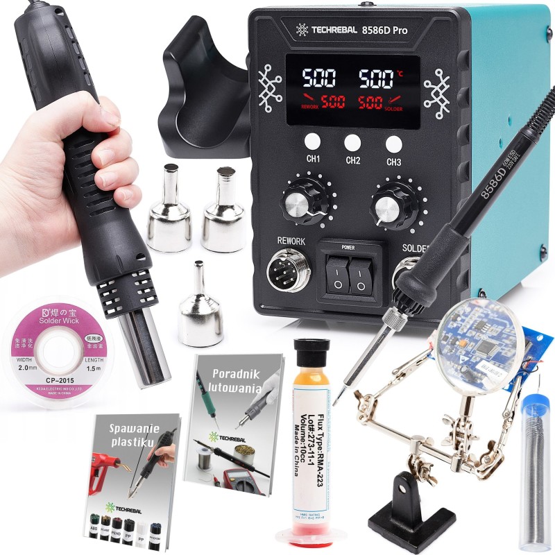Set: 2-in-1-Heißluft-Lötstation mit Lötkolben Techrebal 8586 + Zubehör