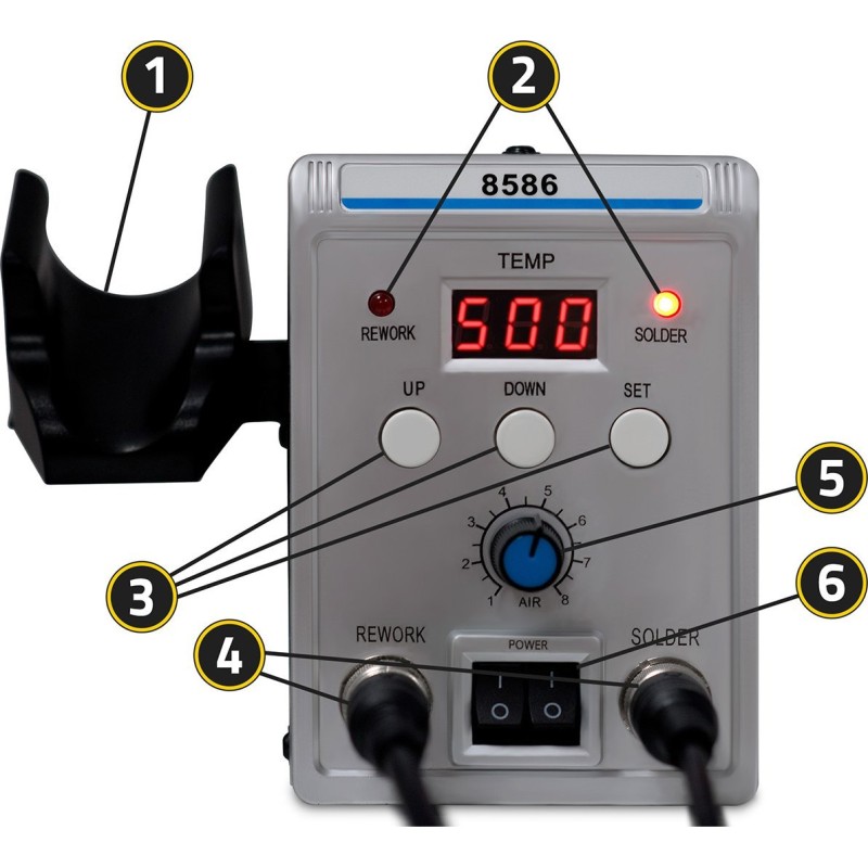 4. Anschluss für den Heißluftkolben und den Lötkolben.