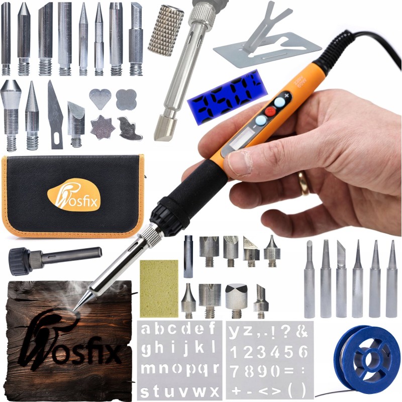 11-in-1-Set: Präzisionslötkolben mit Display Rosfix Orange Rottweiler Serie Electric S (Lötkolben, 6 Lötspitzen, Schwamm, Lot und Ständer) + 30 Elemente zum Holzbrandmalen (27 Spitzen, Adapter 900M, 2 Schablonen) + Organizer (Stifteetui) für Werkzeuge Rosfix 265x140x50mm