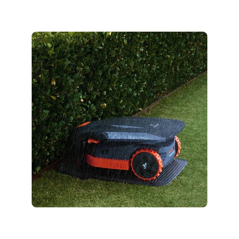 Das mit einem Regensensor ausgestattete Gerät ist in der Lage, Regen zu erkennen. Es unterbricht dann die Arbeit und kehrt zu seiner Ladestation zurück, um ein mögliches Abtragen des Rasens zu verhindern. Der Roboter nimmt die Arbeit wieder auf, sobald sich das Wetter bessert.