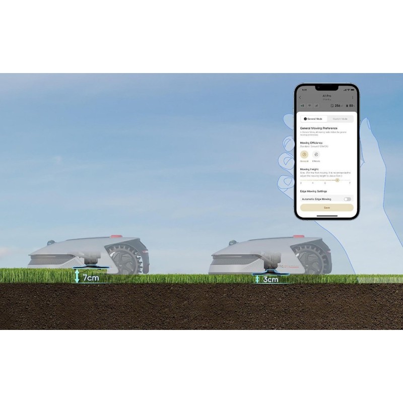 Dank fortschrittlicher Algorithmen und 3D-Technologie erkennt der A1 Pro Menschen, Tiere und Objekte wie Gartenmöbel oder Spielzeug und umfährt diese während der Arbeit effektiv. Spezielle Geländeräder sorgen für hervorragende Traktion auf unebenem Gelände und bei schwierigen Wetterbedingungen, sodass der Roboter Steigungen von bis zu 45 % problemlos bewältigt.