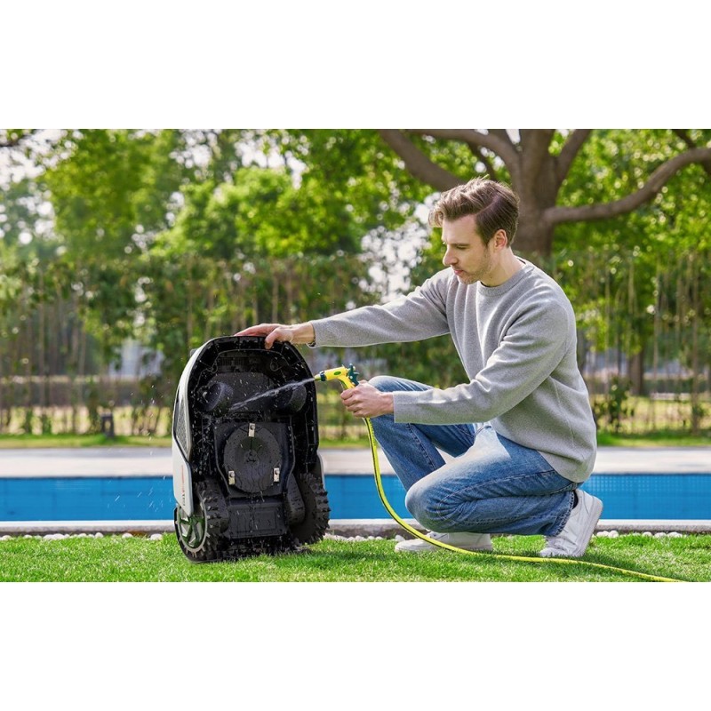 Der A1 Pro kehrt automatisch zur Ladestation zurück, sobald der Akkuladestand unter 15 % fällt. Nach dem Aufladen setzt der Roboter die unterbrochene Aufgabe fort. Die Schutzklasse IPX6 ermöglicht das einfache und sichere Abspülen der Außen- und Unterseiten des Roboters unter fließendem Wasser und sorgt so für eine schnelle und bequeme Reinigung. Der Austausch der Messer erfolgt dank des Schnellwechselsystems im Handumdrehen – du benötigst dafür nicht einmal zusätzliches Werkzeug.