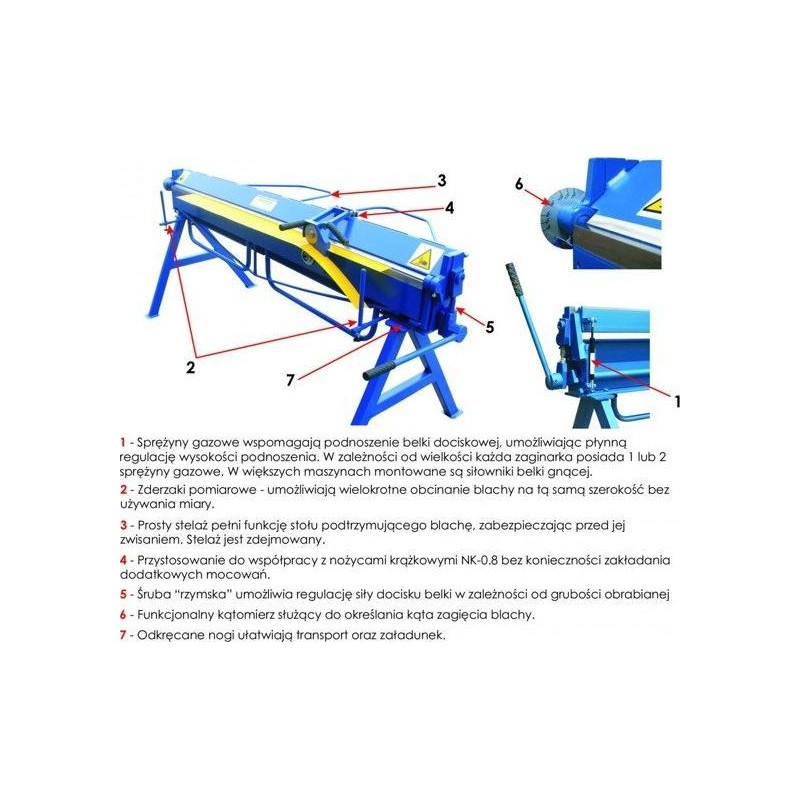 Die Biegemaschine ZG-2500/1,2 ist mit zwei Hubzylindern für den Druckbalken und einem Hubzylinder für den Biegebalken ausgestattet und wurde vor allem für Blechbearbeitungsbetriebe sowie für Unternehmen aus dem Bereich Lüftungstechnik entwickelt, die mit Blechen mit einer Länge von bis zu 2500 mm und einer Dicke von 1,2 mm arbeiten. Die Erzielung solch guter Arbeitsparameter der Biegemaschine wird durch den Einsatz von starken und robusten (35 mm dicken!) Seitenmechanismen sowie deutlich vergrößerten Querschnitten der Arbeitsbalken ermöglicht. Zusätzlich verfügen die Seitenmechanismen über Messingbuchsen mit Direktschmierung in jedem Drehteil, was die Lebensdauer der Maschine erhöht.