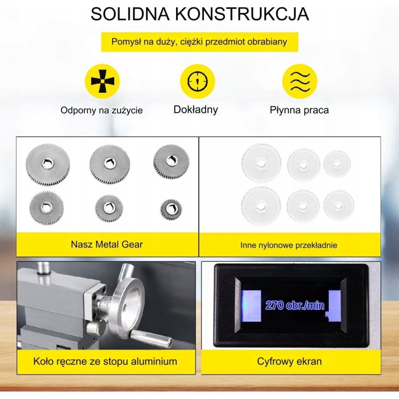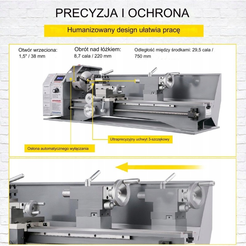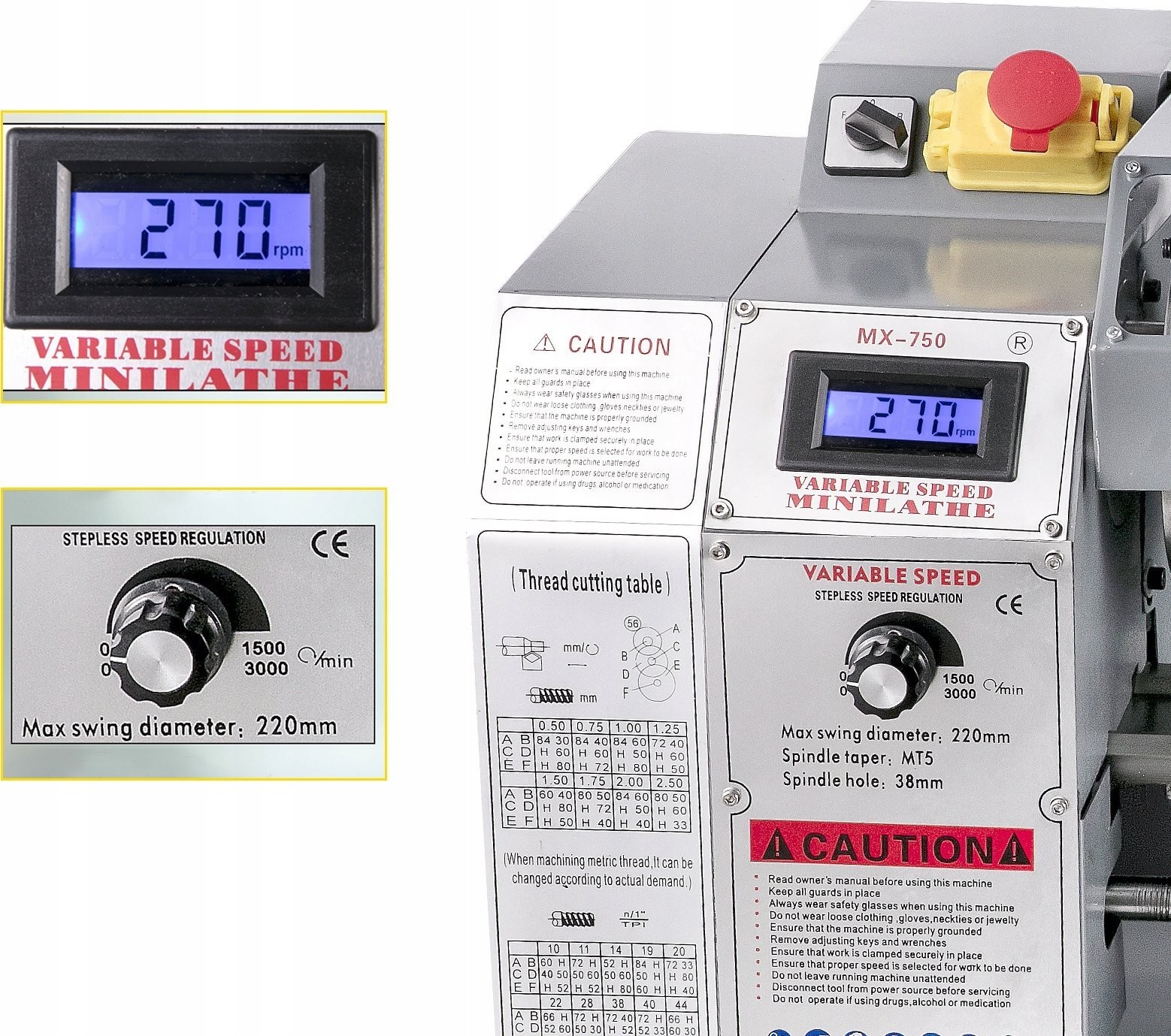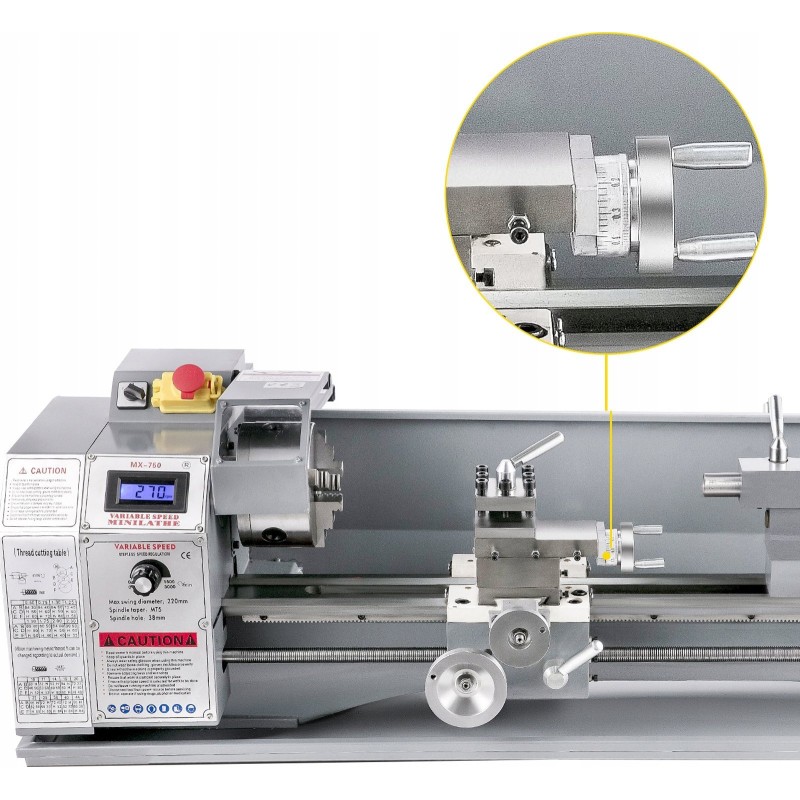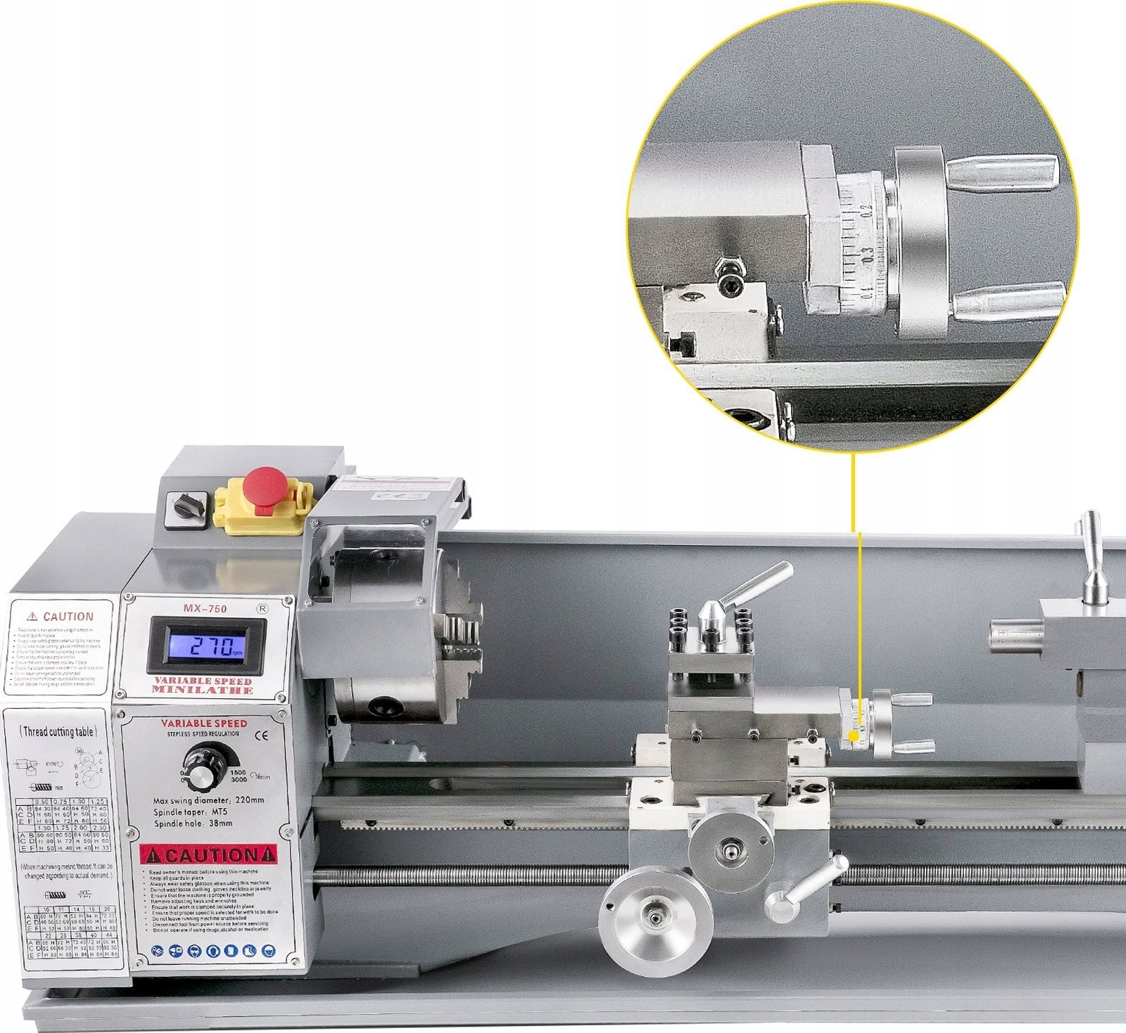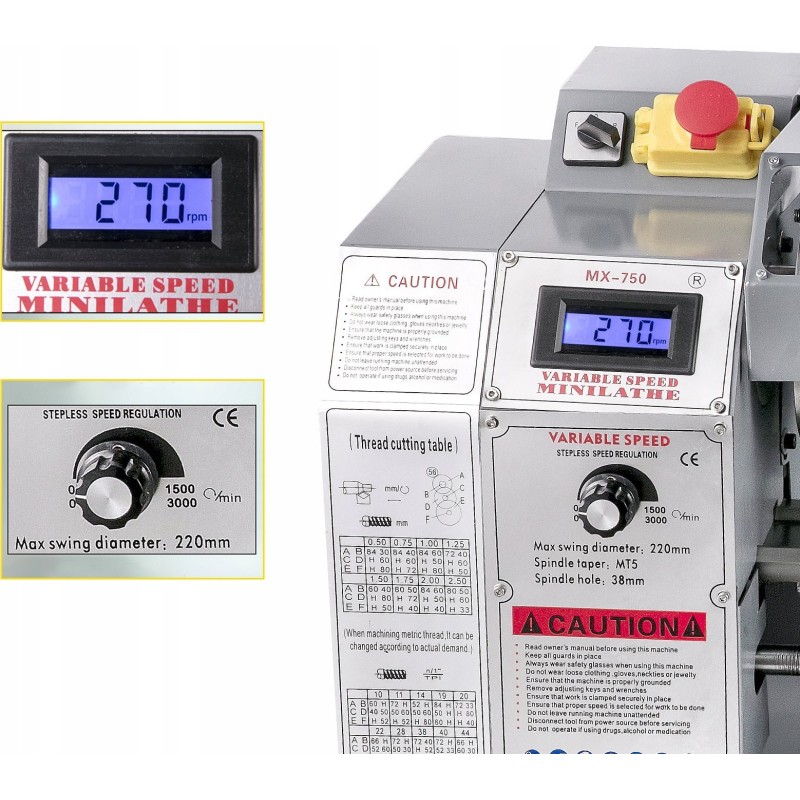 • Die präzise Mini-Metall-Drehmaschine mit den Abmessungen 220 x 750 mm verfügt über einen 1,1-kW-Motor, eine Dreifach-Spannzange, einen MT5-Spindelkonus und einen MT2-Reitstockkonus. Sie ist für verschiedene Arten der Metalldrehung ausgelegt und einfach zu bedienen.