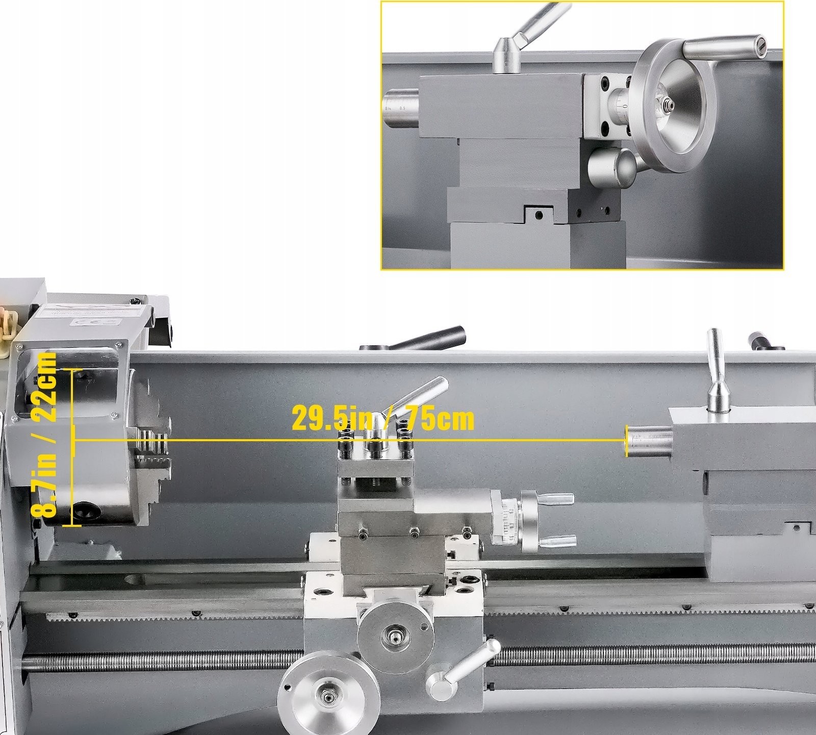 Ausladung über das Bett: 8,7"/220 mm, Ausladung über die geführte Führung: 29,5"/750 mm, Durchmesser des Dreifachspannfutters: 4,9"/125 mm.