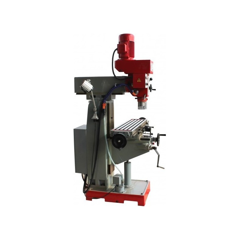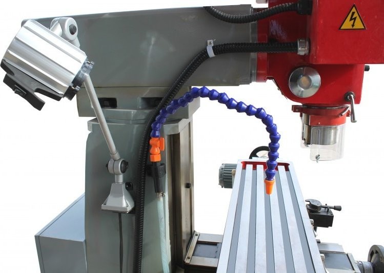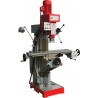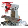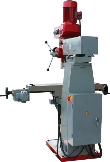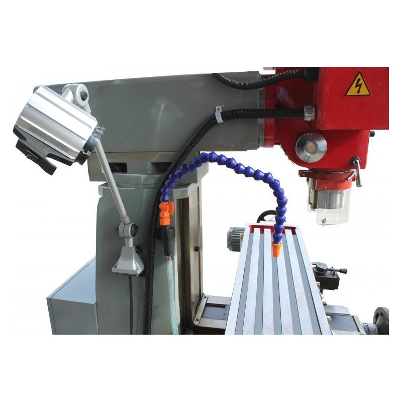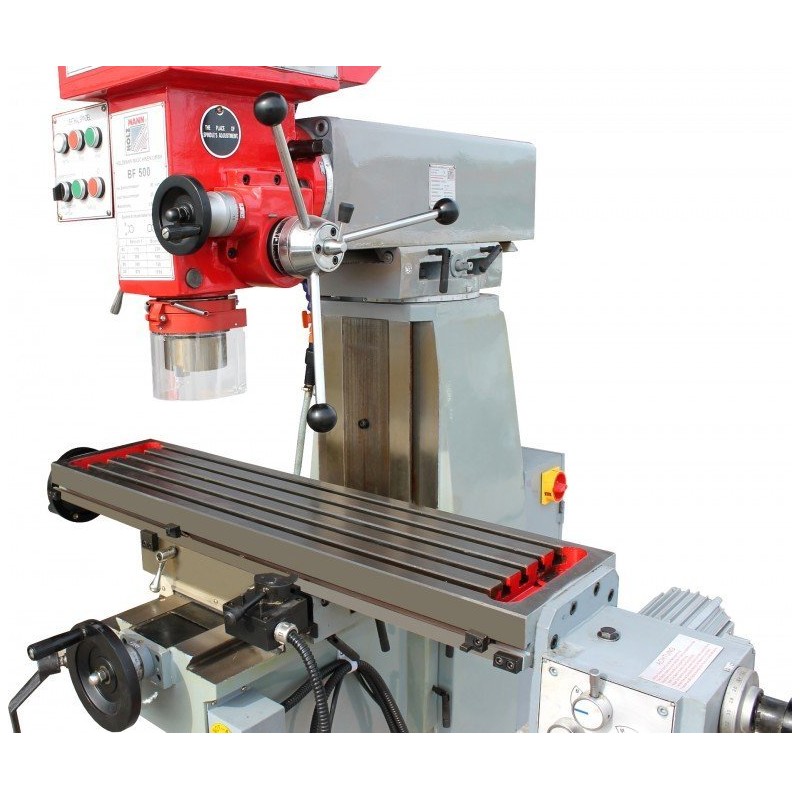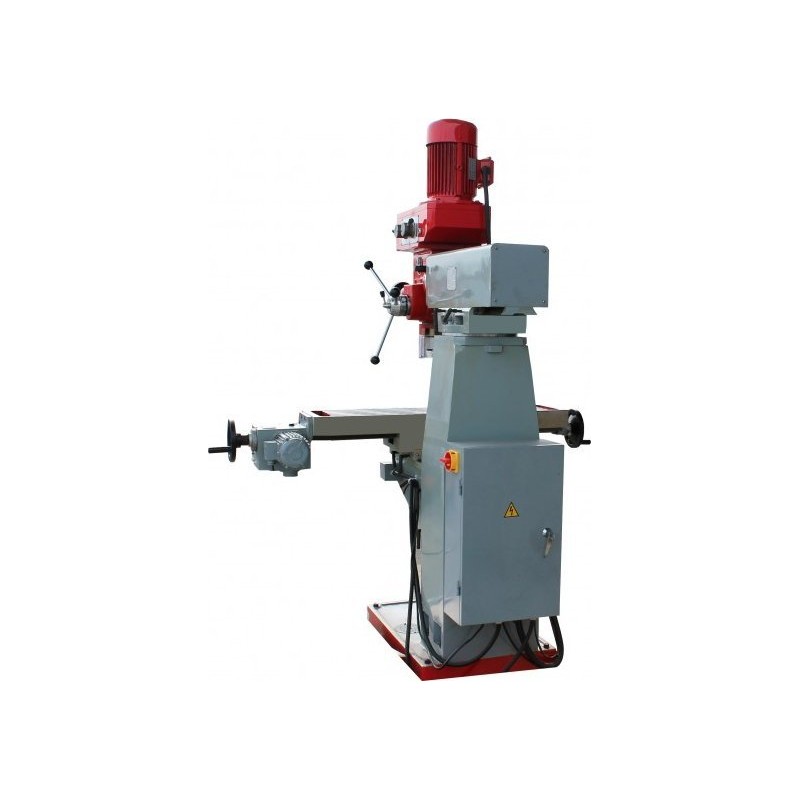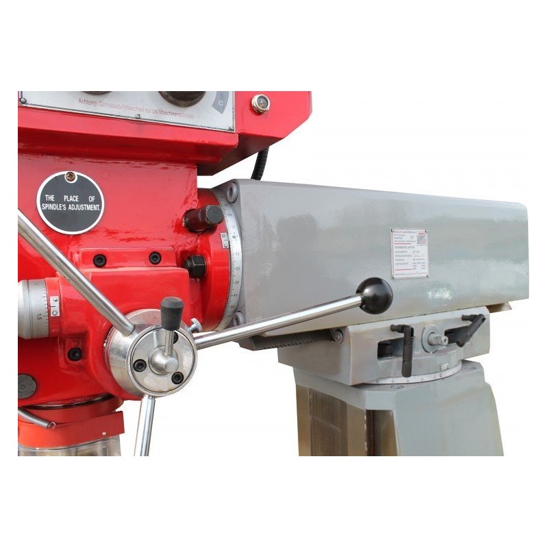 Aus Guss gefertigt, schwer und vibrationsdämpfend, robuster und schwenkbarer (+90° -90°) vertikaler Fräskopf mit Getriebe, Ölgetriebe mit geschliffenen und gehärteten Zahnrädern, Links- und Rechtslauf serienmäßig, Möglichkeit zum Gewindeschneiden von Bohrungen bis M16, Spindelklemmung mittels Dreifachhebel und Präzisionshandrad mit Tiefenskala, stabiler und großer Kreuztisch mit 14 mm T-Nuten zur Befestigung von Schraubstöcken etc., automatischer Vorschub der X-Achse mit Geschwindigkeitsregelung über Zahnradgetriebe, einstellbare automatische Endschalter auf der X-Achse, Tischführungen mit Schwalbenschwanzprofil, verstellbar über Keilschienen, verstellbare Anschläge auf allen Achsen, Kühlsystem und Halogenlampe im Lieferumfang enthalten.