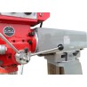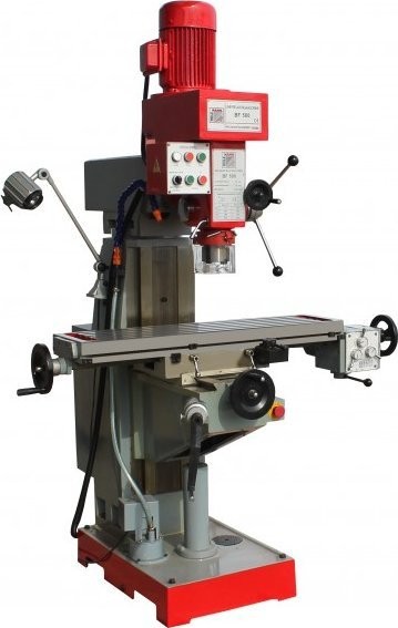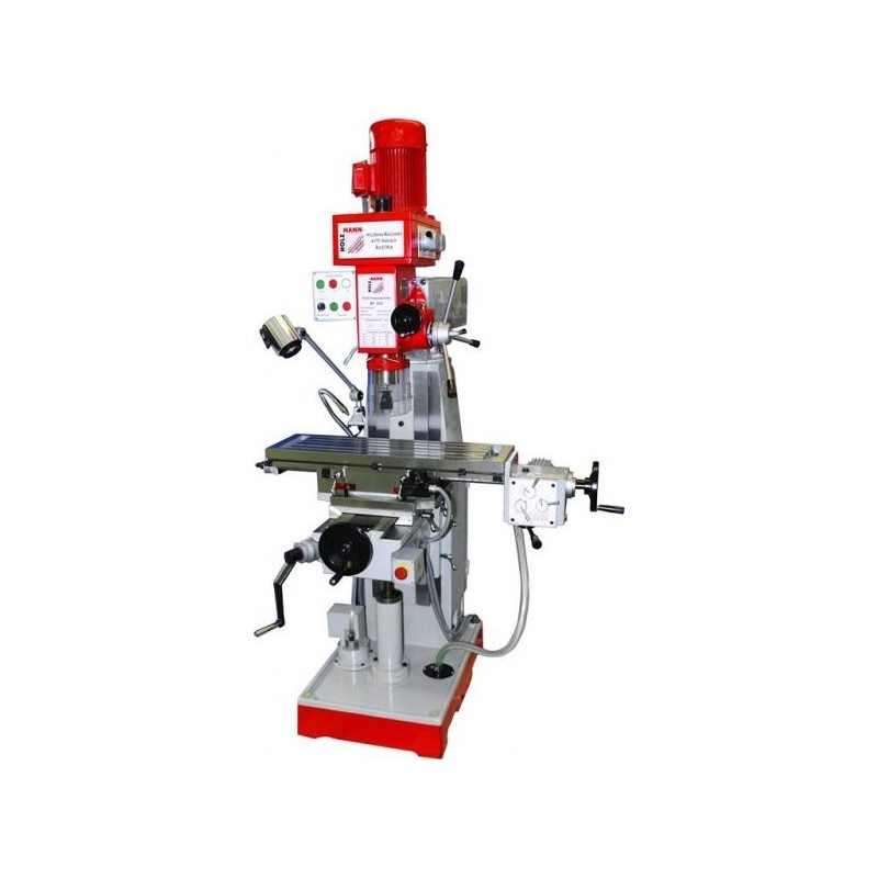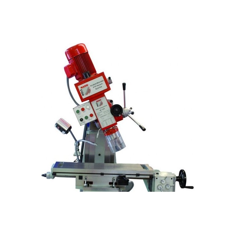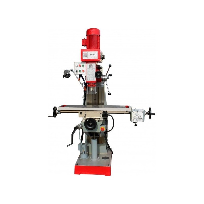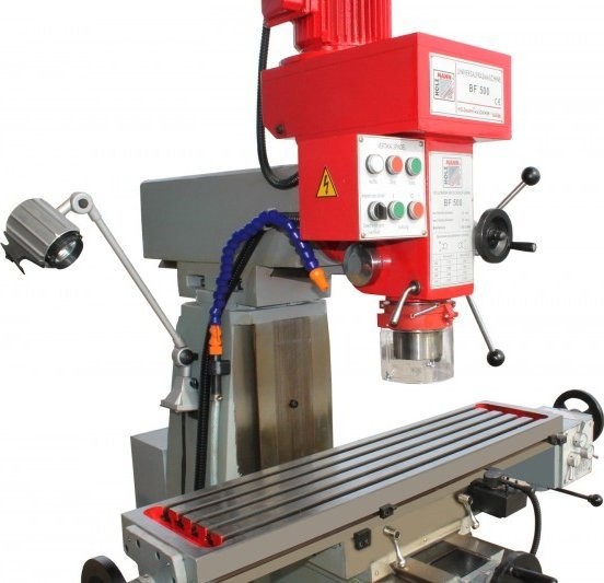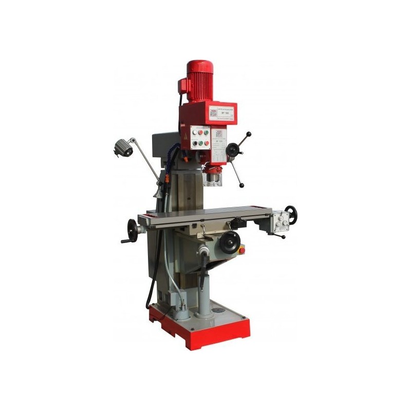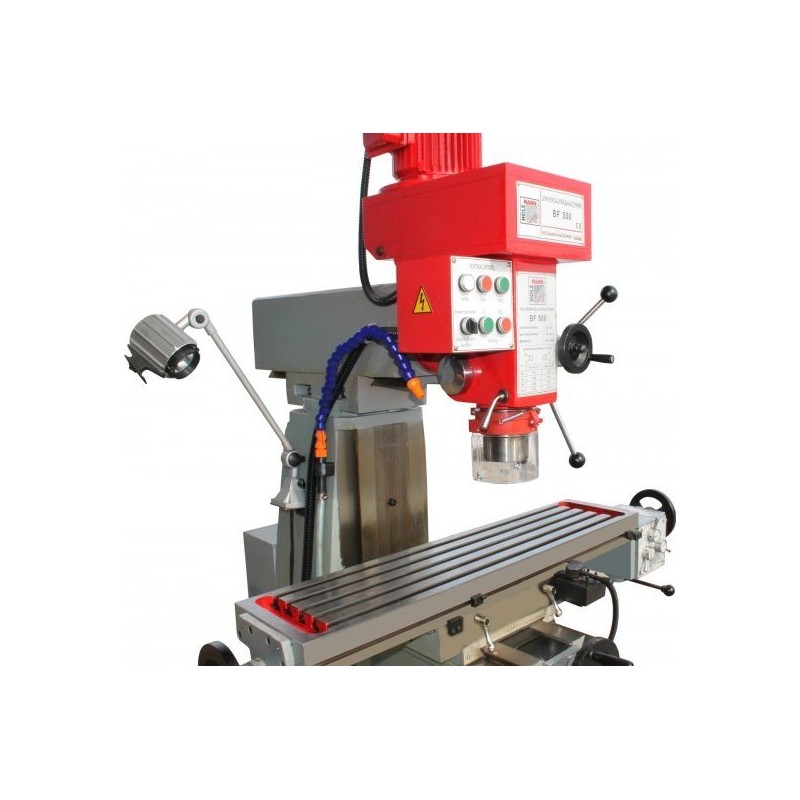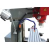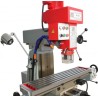 Aus Guss gefertigt, schwer und vibrationsdämpfend, robuster und schwenkbarer (+90° -90°) vertikaler Fräskopf mit Getriebe, Ölgetriebe mit geschliffenen und gehärteten Zahnrädern, Links- und Rechtslauf serienmäßig, Möglichkeit zum Gewindeschneiden von Bohrungen bis M16, Spindelklemmung mittels Dreifachhebel und Präzisionshandrad mit Tiefenskala, stabiler und großer Kreuztisch mit 14 mm T-Nuten zur Befestigung von Schraubstöcken etc., automatischer Vorschub der X-Achse mit Geschwindigkeitsregelung über Zahnradgetriebe, einstellbare automatische Endschalter auf der X-Achse, Tischführungen mit Schwalbenschwanzprofil, verstellbar über Keilschienen, verstellbare Anschläge auf allen Achsen, Kühlsystem und Halogenlampe im Lieferumfang enthalten.