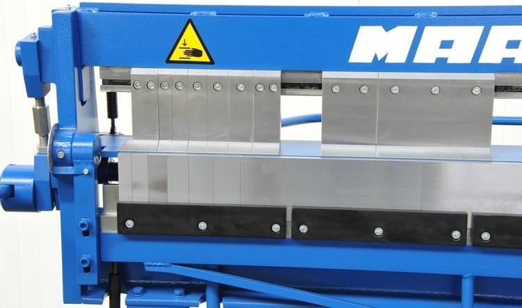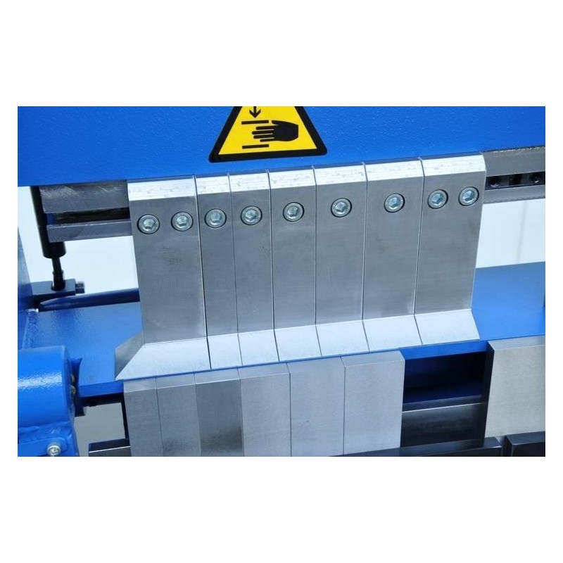 Der obere und untere Balken sind mit Segmentmessern in den Abmessungen 25/30/35/40/45/50/75/100/150/200/250/270 mm ausgestattet. Die Messer bestehen aus hochwertigem Stahl, der einen langjährigen Betrieb der Biegemaschine unter Beibehaltung der entsprechenden Biegeparameter gewährleistet. Der Durchgang zwischen dem Maschinenunterbau und den oberen Messern beträgt bis zu 102 mm, der maximale Biegewinkel bis zu 155 Grad und die Breite des Biegebalkens nur 15 mm, was zu sehr umfangreichen Möglichkeiten bei der Blechbearbeitung führt.
