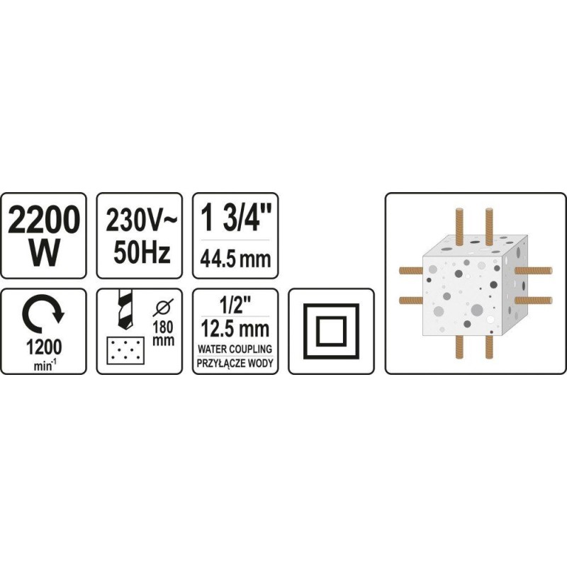 Universelle Diamantbohrmaschine für den Einsatz mit Stativ oder als Handgerät. Die Maschine hat eine Leistung von 2200 W und arbeitet mit einer Drehzahl von 0–1200 U/min. Sie ermöglicht das Bohren von Löchern in einem sehr breiten Bereich von 30 mm bis 180 mm.