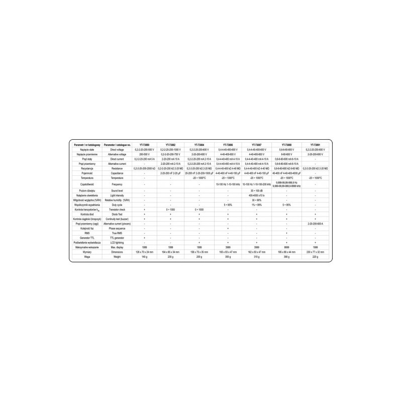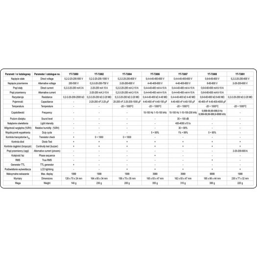 Elektrische Messgeräte (Multimeter) ermöglichen die Messung von Gleich- und Wechselspannung sowie Gleich- und Wechselstrom. Darüber hinaus ermöglicht das Universal-Messgerät YT-73087 die Messung von Widerstand, Kondensatorkapazität, Stromfrequenz, Temperatur und Füllfaktor sowie die Überprüfung von Dioden. Darüber hinaus kann das Universalmessgerät YT-73087 die relative Luftfeuchtigkeit (von 30 bis 90 %), den Schallpegel (von 35 dB bis 100 dB) und die Beleuchtungsstärke (von 4000 bis 40000 Lux) messen. Darüber hinaus ermöglicht das Digitalmessgerät YT-73087 die Temperaturmessung, was besonders bei der Erkennung defekter Komponenten in elektrischen Anlagen nützlich ist (ein erhöhter Widerstand, z. B. eines beschädigten Kabels, führt zur Erwärmung der Komponente). Alle Funktionen des Multimeters YT-73087 ermöglichen eine wesentlich umfassendere Beurteilung der Funktionsqualität elektrischer Geräte als herkömmliche Messgeräte. Wir können die von einer Glühbirne erzeugte Lichtmenge sowie die Leistungsfähigkeit einer Beschallungsanlage prüfen. Außerdem können wir überprüfen, ob die Bedingungen für den Betrieb elektrischer Geräte geeignet sind (Feuchtigkeit und Temperatur). Die automatische Bereichswahl verkürzt die Messzeit erheblich. Bei der Messung von zuvor nicht abgeschätzten Werten muss man bei einem herkömmlichen Universal-Messgerät die Messungen nacheinander vom größten Bereich bis zu dem Bereich durchführen, der das genaueste Ergebnis liefert – andernfalls riskiert man eine Beschädigung des Multimeters. Beim Multimeter YT-73087 hingegen genügt eine einzige Messung, das Messgerät findet automatisch den optimalen Messbereich. Der Messbereich kann auch manuell über die Taste „Range“ ausgewählt werden. Eine zusätzliche Funktion des Messgeräts ist die Taste „REL“, die die Messung relativer Werte ermöglicht. Diese Funktion ist für jede Position des Wahlschalters verfügbar (außer bei Frequenzmessungen, Tastverhältnismessungen sowie Leitfähigkeits- oder Diodentests). Der Summer ist bei der Überprüfung elektrischer Anlagen nützlich – er ermöglicht eine einfache Überprüfung der Durchgängigkeit eines Stromkreises. Die automatische Abschaltfunktion des Multimeters schont die Batterien. Das YT-73087 ist, wie andere YATO-Multimeter in unserem Angebot, mit einem sogenannten Holster ausgestattet – einer Gummihülle, die das Messgerät vor mechanischen Beschädigungen schützt. Der beleuchtete Bildschirm des Messgeräts ermöglicht den Einsatz bei schlechten Lichtverhältnissen.