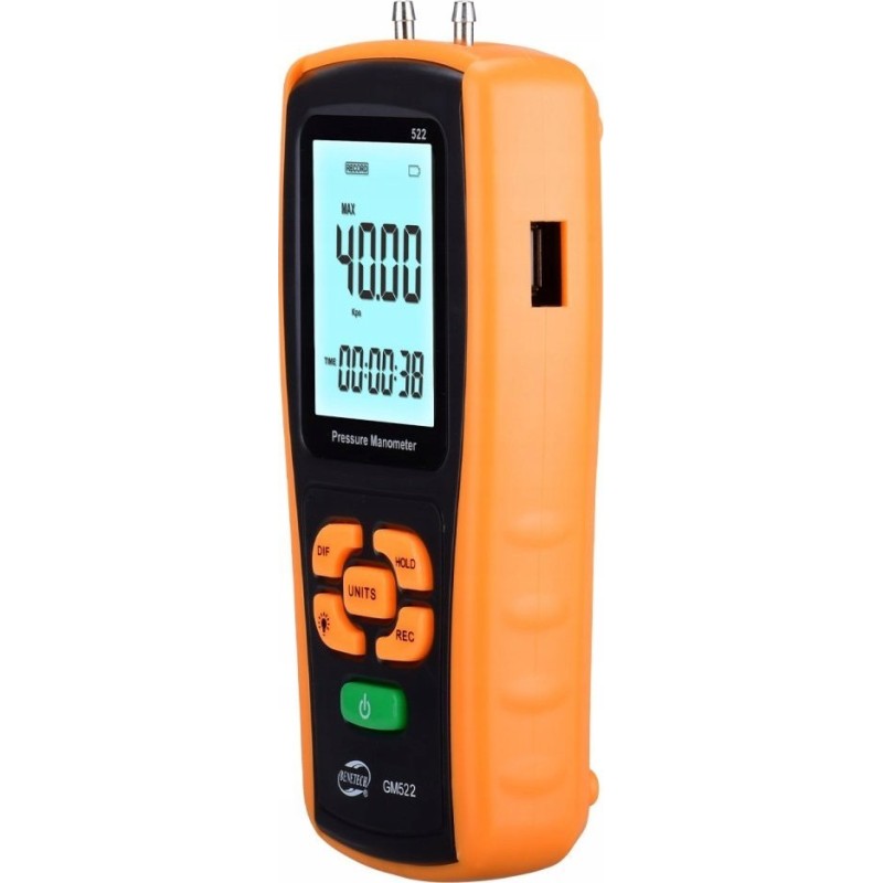 Das Manometer Benetech GM522 verfügt über ein übersichtliches Display, das über die aktuellen Messwerte und den Ladezustand der Batterie informiert. Zusätzliche Funktionen wie der Datenaufzeichnungsmodus und die Möglichkeit, die Einheiten zu ändern, machen die Bedienung des Geräts intuitiv und komfortabel.