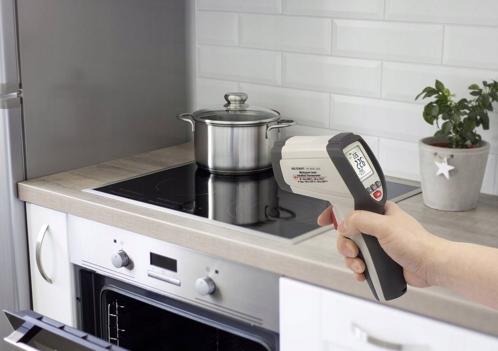 Robustes und praktisches Infrarot-Thermometer mit Pistolengriff zur berührungslosen Temperaturmessung zwischen Vielseitig einsetzbar – zu Hause, in der Freizeit oder bei der Arbeit. Auf Knopfdruck lassen sich berührungslos und sicher die Oberflächentemperaturen von rotierenden Teilen, stromführenden Leitungen, schwer zugänglichen Stellen oder gefährlich heißen Gegenständen messen. Dank des großen Messbereichs und der hohen Auflösung bietet das Gerät ein breites Anwendungsspektrum. Zu Hause lassen sich Probleme mit der Isolierung anhand von Temperaturunterschieden an Außenwänden, Türen und Fenstern feststellen. Aber auch in der Freizeit und bei der Arbeit scheinen die Einsatzmöglichkeiten Ihres Infrarot-Thermometers grenzenlos zu sein (z. B. Überprüfung der Temperatur von Elektroinstallationen, Kontrolle von Heizkörpern, Überwachung von Lebensmitteln usw.). Darüber hinaus eignen sich IR-Thermometer hervorragend für Messungen aus mehreren Metern Entfernung von einem einzigen Standpunkt aus, was Zeit und Geld spart. Einstellbarer Emissionsgrad Dank des einstellbaren Emissionsgrads eignet sich das Voltcraft IR 800-20C Infrarot-Thermometer zur Temperaturmessung verschiedener Oberflächen, sowohl von dunklem Mauerwerk als auch von glänzenden Metallteilen. Laserkreis zur genauen Darstellung der Messfleckgröße Der Laserkreis des Geräts zeigt die Größe des Messfleckes genau an. Dies ist besonders wichtig, wenn nur bestimmte Bereiche gemessen werden sollen, z. B. an Maschinen. Viele Zusatzfunktionen integriert Der Min/Max-Speicher informiert Sie über die gemessenen Grenzwerte. Auch die Einstellung des Messbereichs für den Alarm ist kein Problem. Werden die Grenzwerte überschritten oder nicht erreicht, löst das Thermometer einen Alarm mit rot blinkender Hintergrundbeleuchtung aus. Dank der kurzen Reaktionszeit lassen sich Punktmessungen schnell durchführen, und die Messwerte können anschließend über die Data-Hold-Funktion auf dem LCD-Display fixieren.