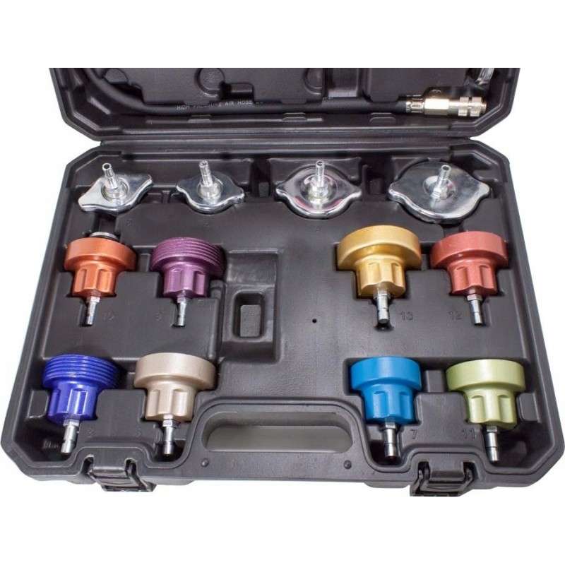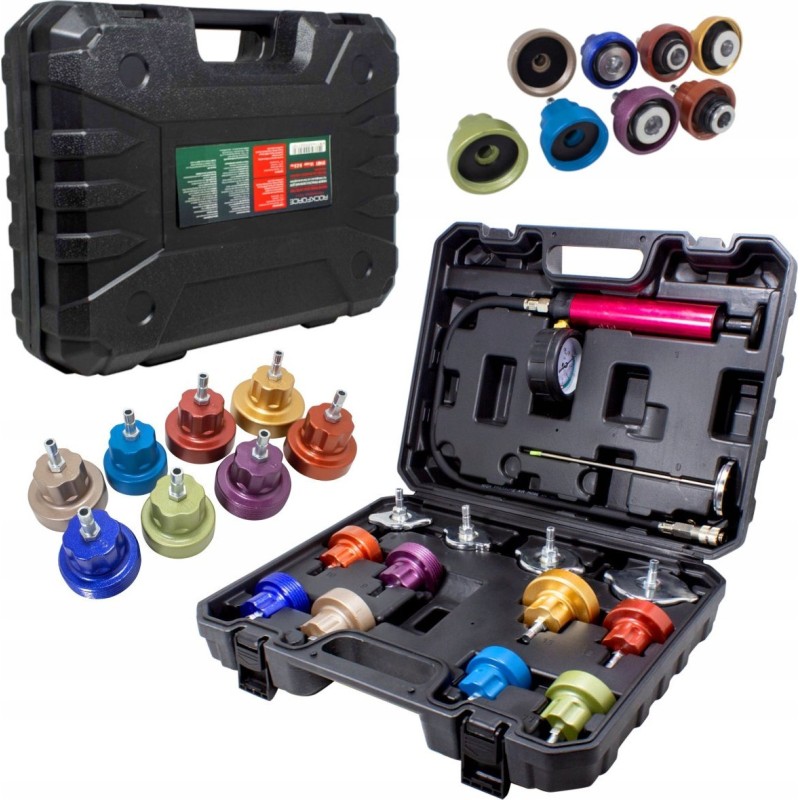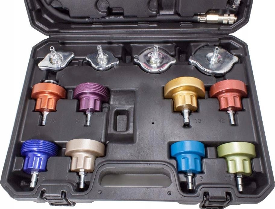 Das Set enthält ein Thermometer, mit dem die Funktionsfähigkeit des Thermostats überprüft werden kann. Es ist mit 12 Adaptern für verschiedene Arten von Kühlern ausgestattet.