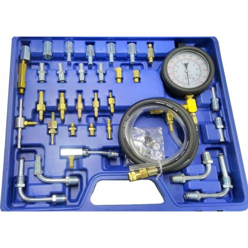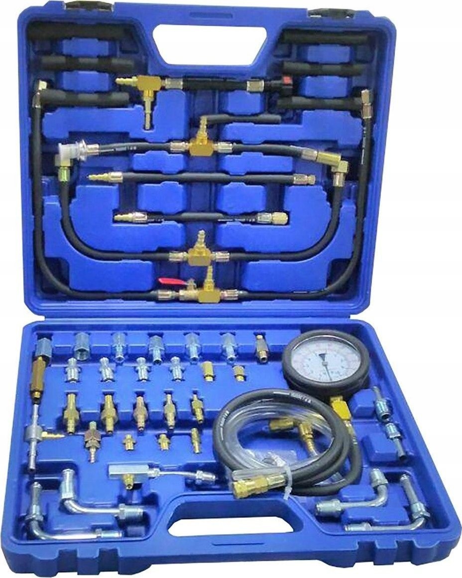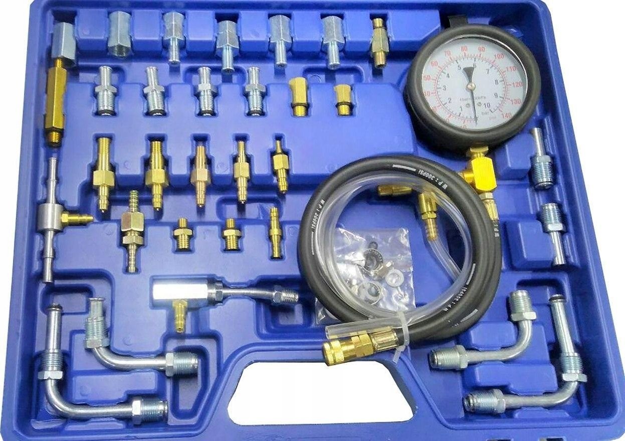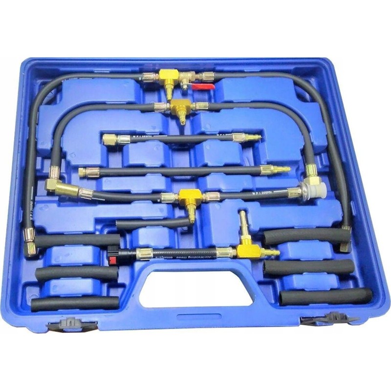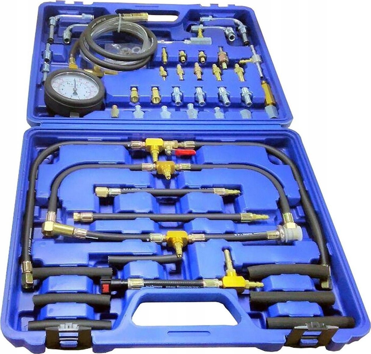 Set zur Prüfung von Einspritzsystemen in Benzinmotoren, Messbereich bis 140 PSI / 10 bar. Für Systeme: K- und KE-Jetronic-SIS-System, KE-Jetronic-KIC-System, L-Jetronic-Liw-System, Druckmessung in Pumpen, Rückdruckmessung. Der Tester dient zur Messung des Kraftstoffdrucks im Kraftstoffsystem der meisten Automarken.