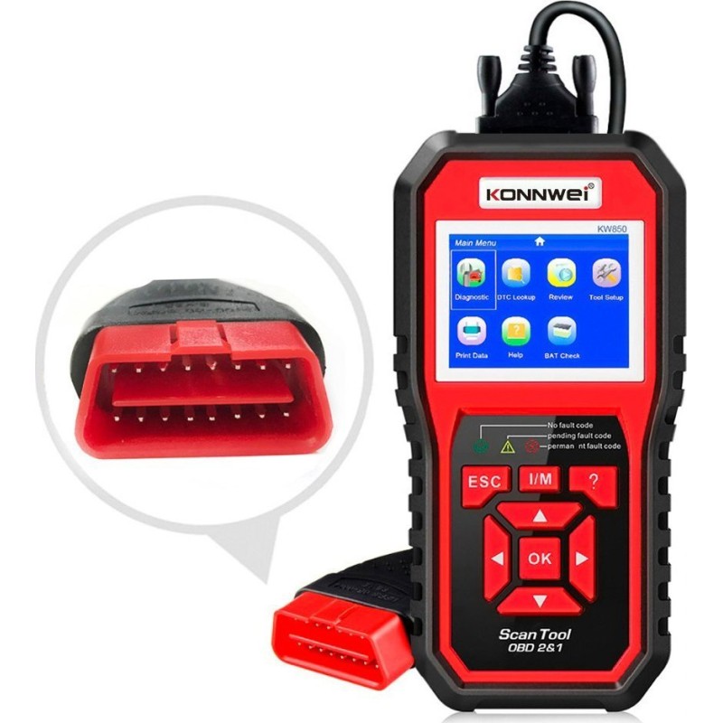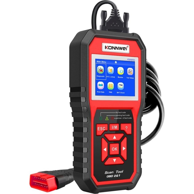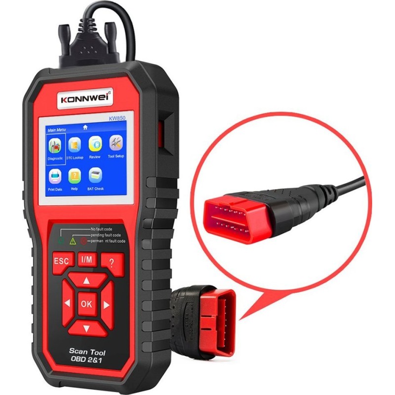 Diagnosegerät, OBD2-Scanner Konnwei KW850 Der universelle Diagnosescanner für Kraftfahrzeuge KM830 ist ein zuverlässiges Werkzeug, das eine umfassende Kontrolle über den Zustand und die Leistung des Fahrzeugs ermöglicht. Das Gerät ist mit verschiedenen Fahrzeugmotortypen kompatibel, darunter Benzin-, Diesel- und Hybridmotoren mit 12 V Spannung. Der KM850 ist mit einer umfangreichen Datenbank mit über 8000 allgemeinen Fehlercodes ausgestattet, wodurch er eine präzise Identifizierung der Ursache der Meldung „CHECK ENGINE“ und eine mögliche Reparatur ermöglicht, ohne dass ein Besuch in der Werkstatt erforderlich ist. Der Diagnosescanner ist auch bei jährlichen Abgasuntersuchungen und Smogkontrollen unersetzlich und hilft dabei, diese Verfahren problemlos zu bestehen. Es bietet den vollen Umfang an OBDII/EOBD-Diagnosefunktionen, einschließlich der Prüfung von O2-Sensoren, EVAP-Systemen und On-Board-Überwachungssystemen. Dank der Anzeige der Datenströme in grafischer und numerischer Form können Sie die Betriebsparameter des Fahrzeugs genau überwachen und potenzielle Probleme mit den Sensorwerten identifizieren. Ein zuverlässiges Werkzeug Für Benzin- und Dieselmotoren Auslesen und Löschen von Fehlern Aktuelle Fahrzeugparameter Sensorprüfung Stromversorgung: über OBD2-Anschluss Sprachen der Benutzeroberfläche: Englisch, Deutsch, Französisch, Spanisch, Italienisch, Portugiesisch, Polnisch, Niederländisch
