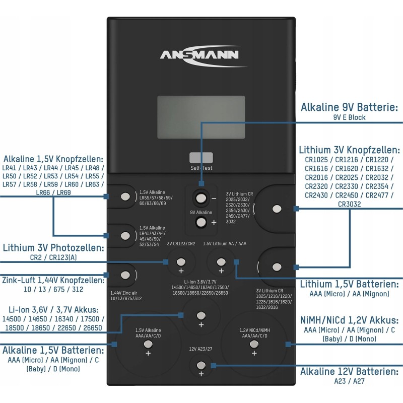 Der Ansmann-Batterietester 1900-0100 unterstützt eine breite Palette von Batterietypen, darunter: