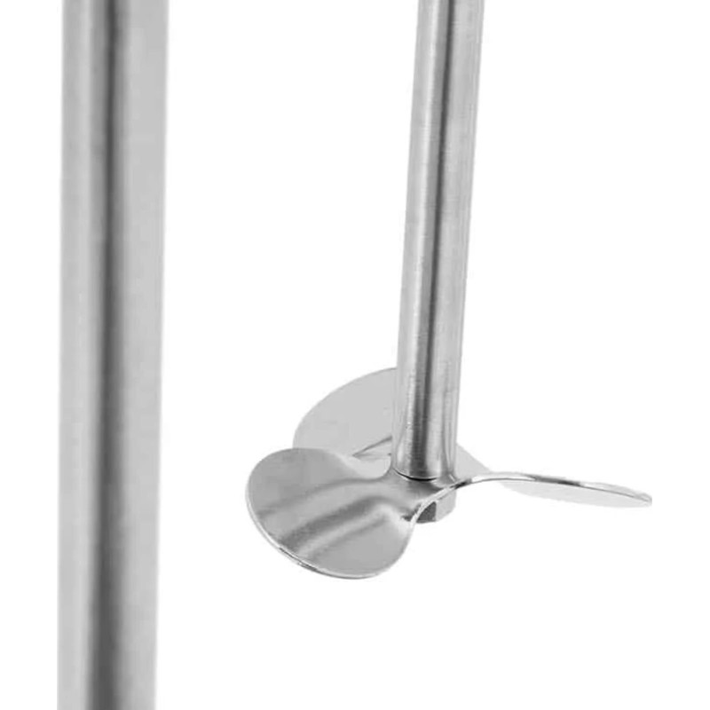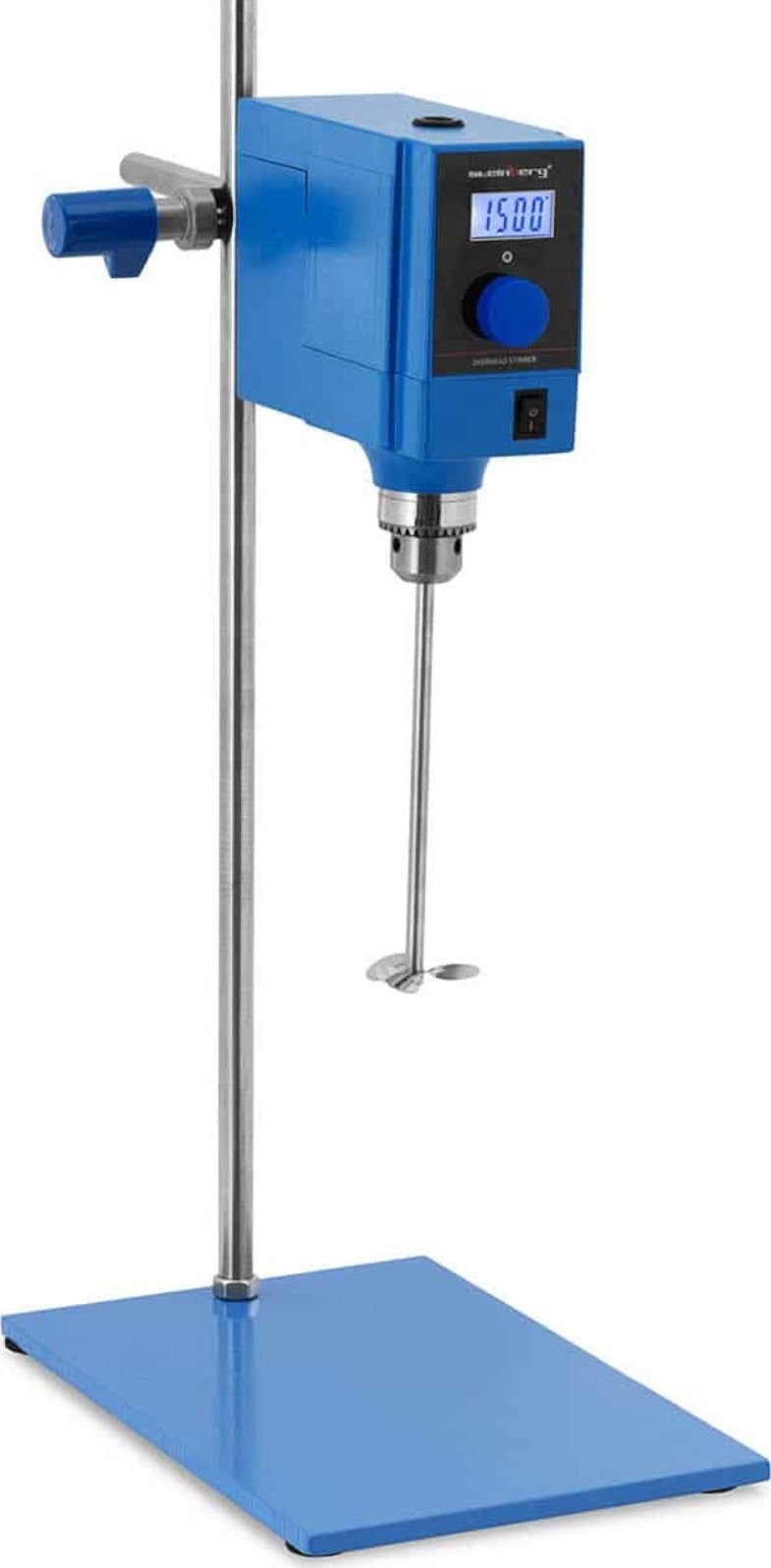 Der Laborrührer der Marke Steinberg Systems sorgt für eine optimale Vermischung von Substanzen im Labor oder in der Werkstatt. Selbst das längere Mischen hochviskoser Substanzen wie Honig, Creme, Öl oder Farbe ist für das Gerät kein Problem. Der bürstenlose Motor mit Kupferwicklung erzeugt bei einer Leistung von 16,6 W eine Drehzahl von bis zu 1500 U/min . Über das gut ablesbare Display lässt sich der gewünschte Wert präzise einstellen. Die hohe Drehzahl vermischt hochviskose Flüssigkeiten in Mengen von bis zu 40 l gleichmäßig bei geringem Stromverbrauch. Das Gerät besteht aus einer Konstruktion aus leichtem Aluminium in Kombination mit PVC. Den Rührer befestigen Sie bequem an einem 70 cm langen Ständer und passen ihn ideal an eine Vielzahl von Gefäßen an. Der 35 cm lange Rührstab aus Edelstahl wird in ein offenes Gefäß eingesetzt, um die Flüssigkeit gleichmäßig und gründlich zu vermischen.