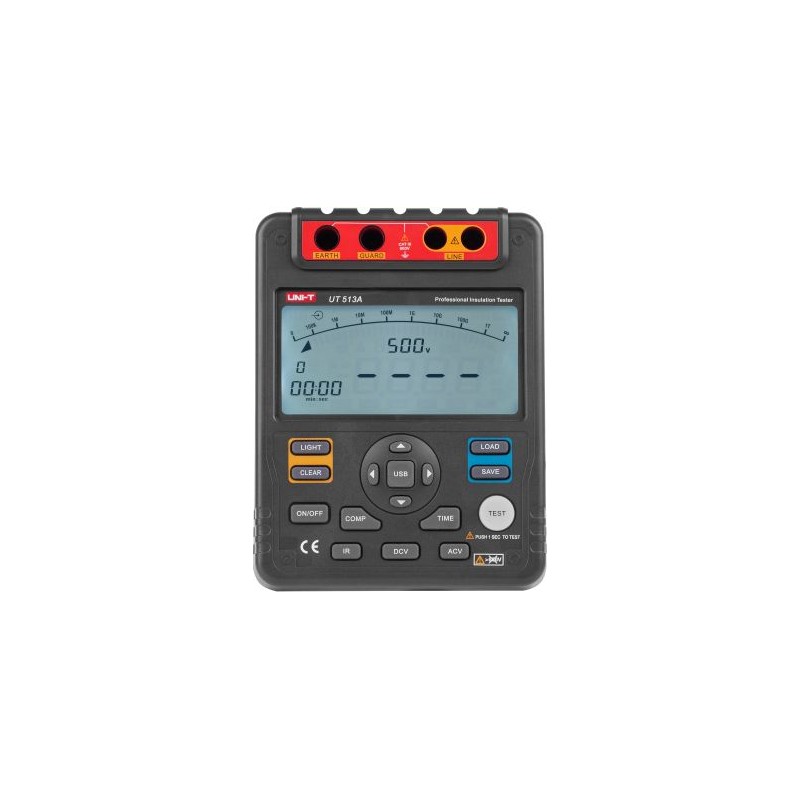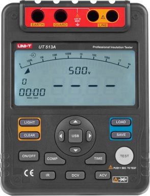 Das Isolationswiderstandsmessgerät UNI-T UT513A ist ein digitales Messgerät, das sowohl für Elektroniker als auch für Elektriker konzipiert ist. Es ermöglicht die Messung hoher Widerstände bis zu 1000 GOhm bei einer Prüfspannung von 5000 V. Unter den zahlreichen Zusatzfunktionen sind insbesondere der Dielektrizitätsabsorptionstest, die Polarisationsindexierung sowie die Vergleichsfunktion hervorzuheben. Dieses Modell entspricht den Anforderungen der Norm IECG1010. MESSBEREICHE Isolationswiderstand Für Prüfspannungen: • 500 V: 0 ~ 20 GOhm • 1000 V: 0 ~ 40 GOhm • 2500 V: 0 ~ 100 GOhm • 5000 V: 0 ~ 1000 GOhm Genauigkeit: • 0 ~ 99,9 MOhm ±(3 % + 5) • 100 MOhm ~ 9,99 GOhm ±(5 % + 5) • 10 GOhm ~ 99,9 GOhm ±(10 %+5) • über 100 GOhm ±(20 %+5); für relative Luftfeuchtigkeit