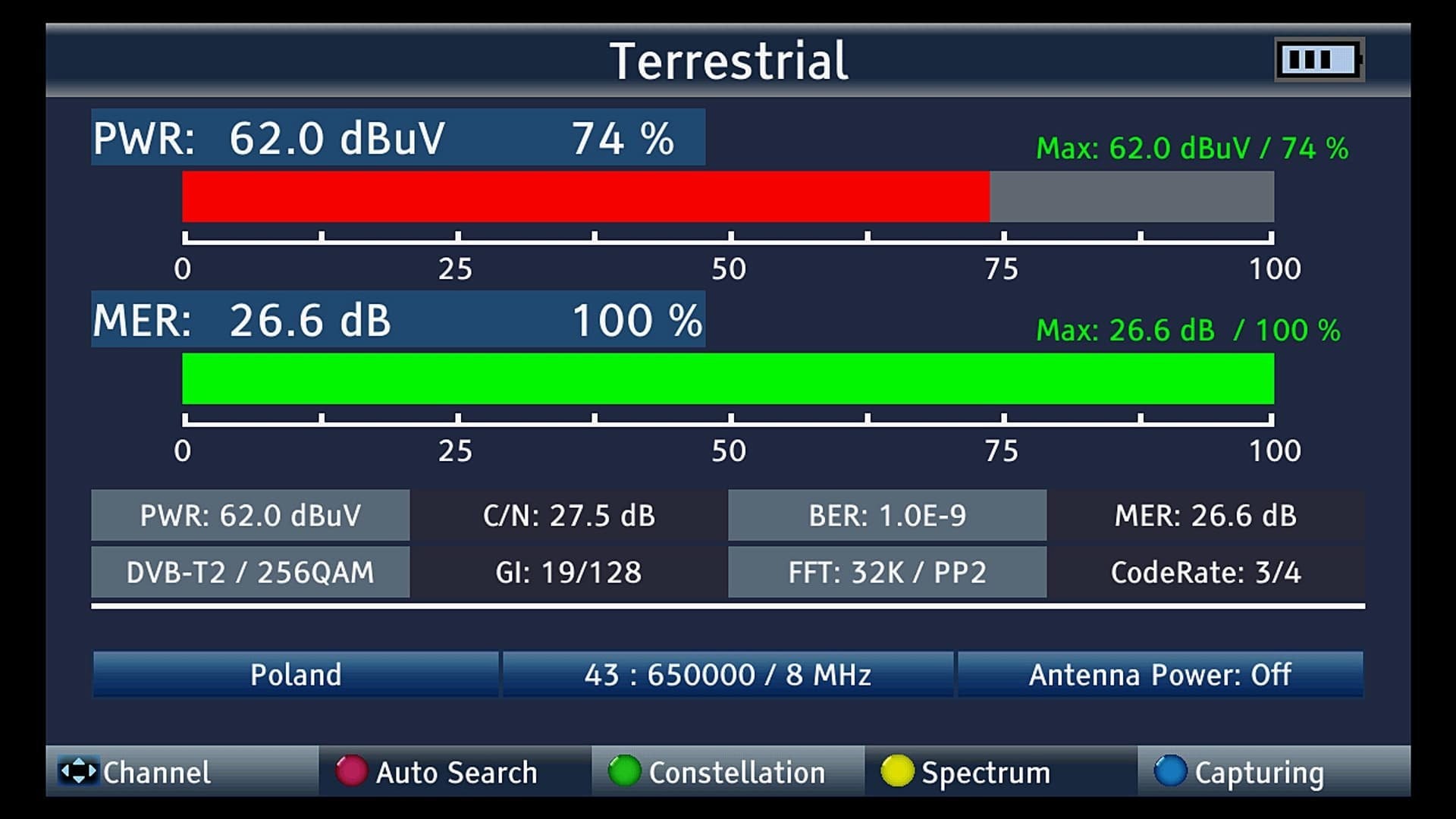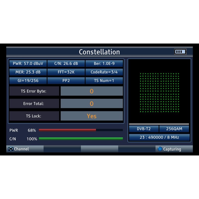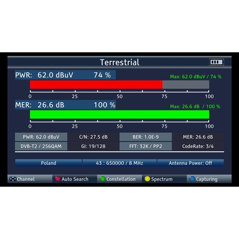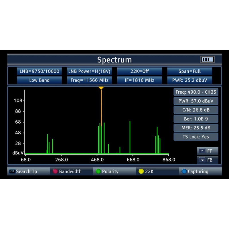 Das Messgerät verfügt über einen integrierten Tuner, der eine kontinuierliche Vorschau des eingestellten Kanals ermöglicht, sowie über einen Spektrumanalysator.