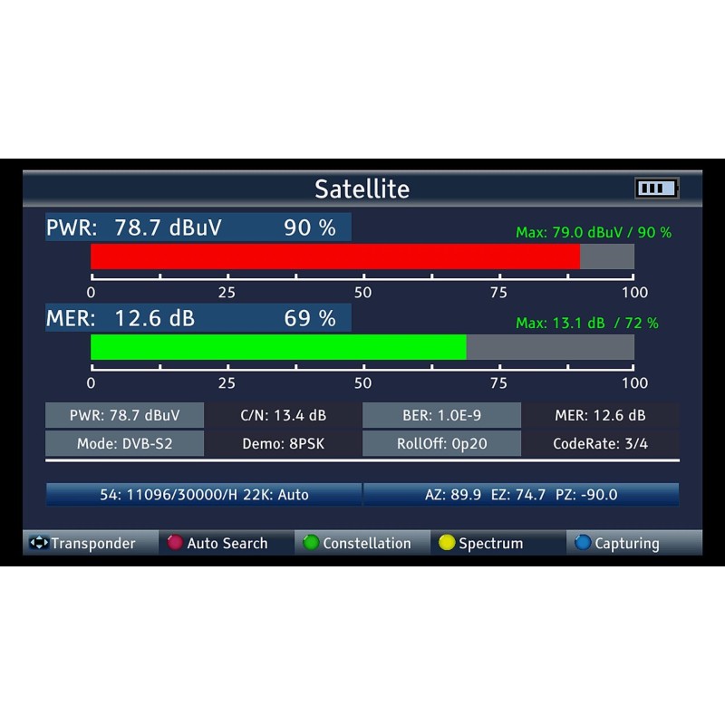 • Messung aller erforderlichen Signalparameter wie: Signalpegel in dBμV, C/N, BER, MER