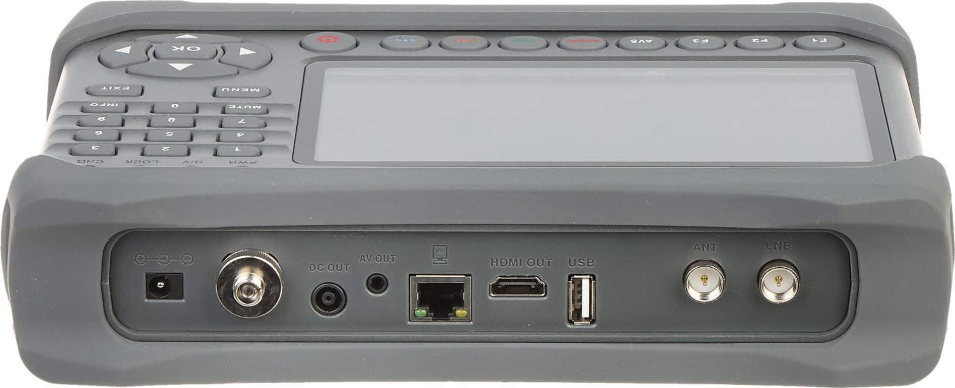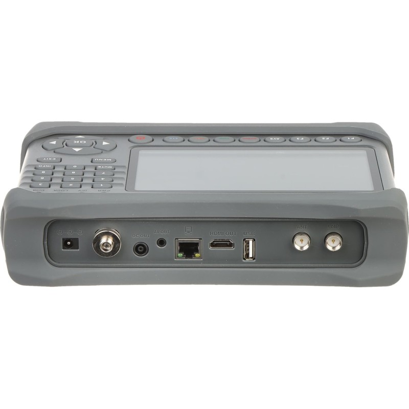 Darüber hinaus ermöglichen der externe HDMI-Eingang und -Ausgang den Anschluss einer Signalquelle und die Bildanzeige auf dem Fernseher über ein HDMI-Kabel. Das Gerät ermöglicht die Messung von Parametern wie: Signalpegel in dBμV, C/N, MER.