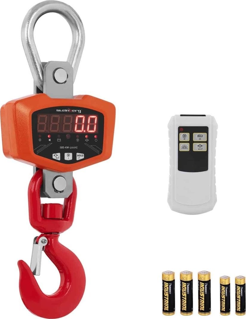 Neben der Hakenwaage ist im Lieferumfang auch eine Fernbedienung zur Steuerung des Geräts enthalten. Ihre Reichweite beträgt 5 m. Das Modell SBS-KW-3000KE ist mit praktischen Funktionen wie HOLD, SAVE, ZERO sowie der Umschaltung der Gewichtseinheiten (kg, lb) ausgestattet. Es verfügt zudem über eine Warnung bei Überlastung und niedrigem Batteriestand.