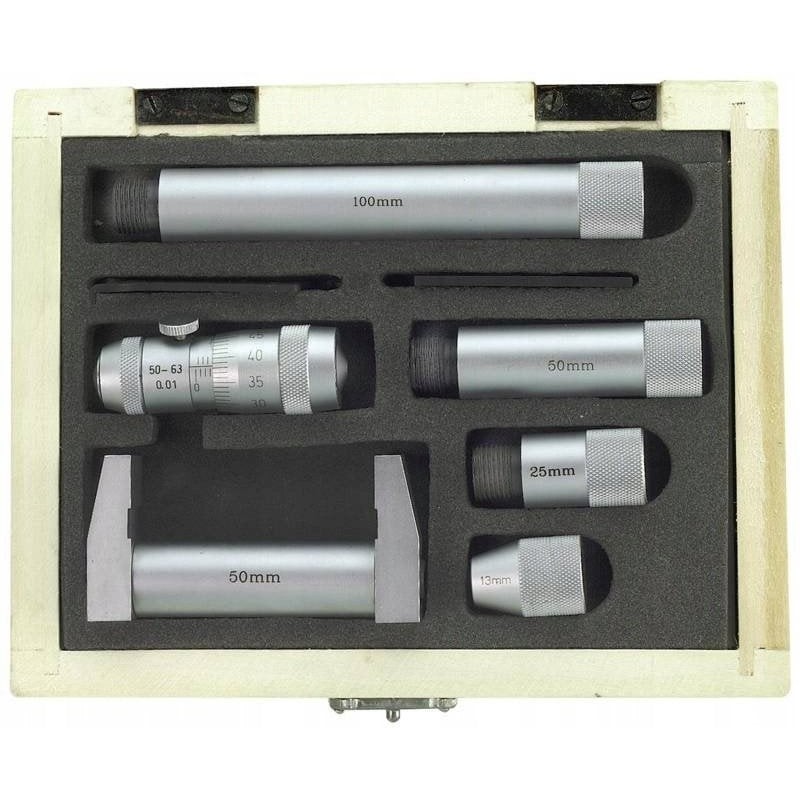 Das Set enthält einen Mikrometerkopf und Verlängerungshülsen