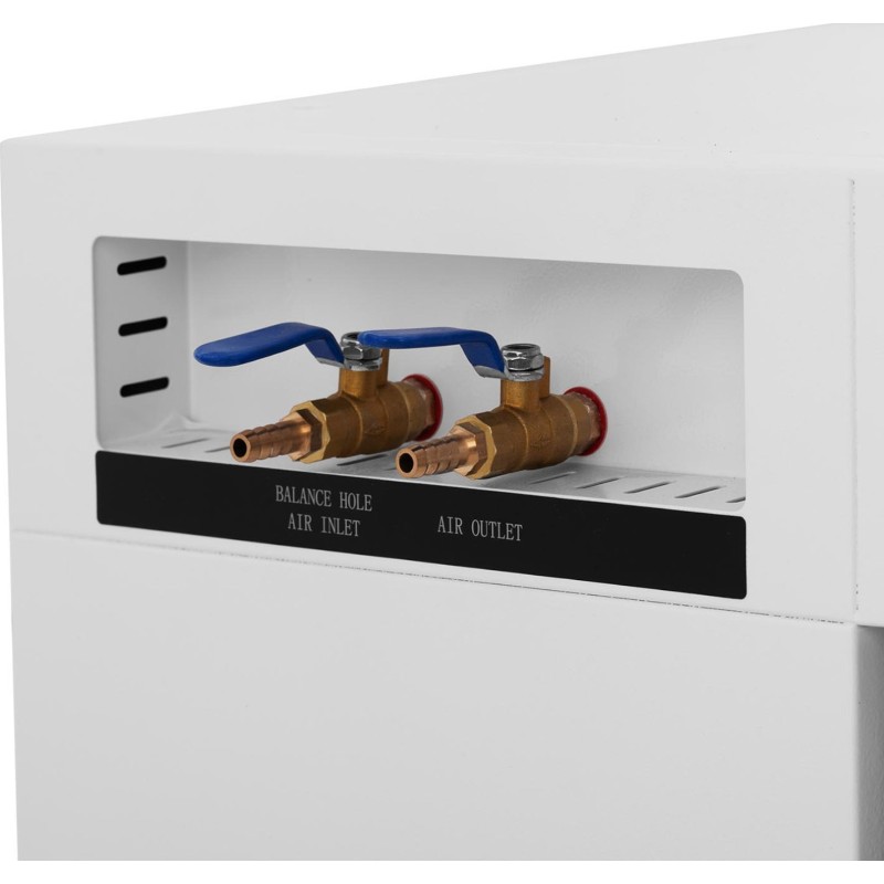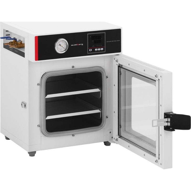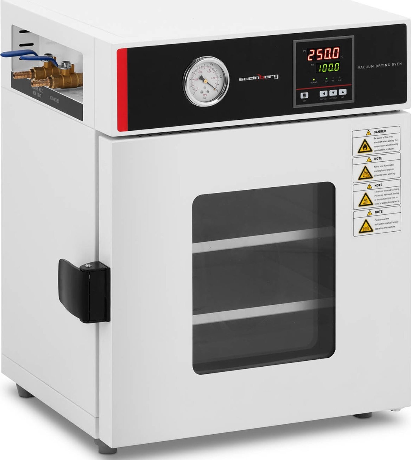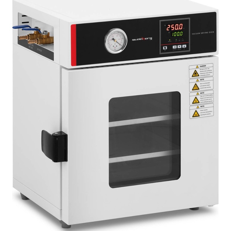 Der Vakuumtrockner der Marke Steinberg Systems ist ein professionelles Gerät zum Trocknen, Desinfizieren und Sterilisieren von Gegenständen und Instrumenten in wissenschaftlichen, biochemischen oder medizinischen Labors. Die Leistung des Trockners beträgt 800 W . Das große Fassungsvermögen von 25 l ermöglicht das gleichzeitige Trocknen mehrerer Gegenstände. Die Temperatur ist im Bereich bis 250 °C einstellbar. Das Gehäuse besteht aus Stahl und ABS-Kunststoff , das Sichtfenster aus gehärtetem Glas. Das digitale LED-Display ermöglicht ein einfaches Ablesen der eingestellten Werte. Das Gerät verfügt über die Schutzklasse EN1 und erzeugt einen maximalen Druck von 133 Pa .