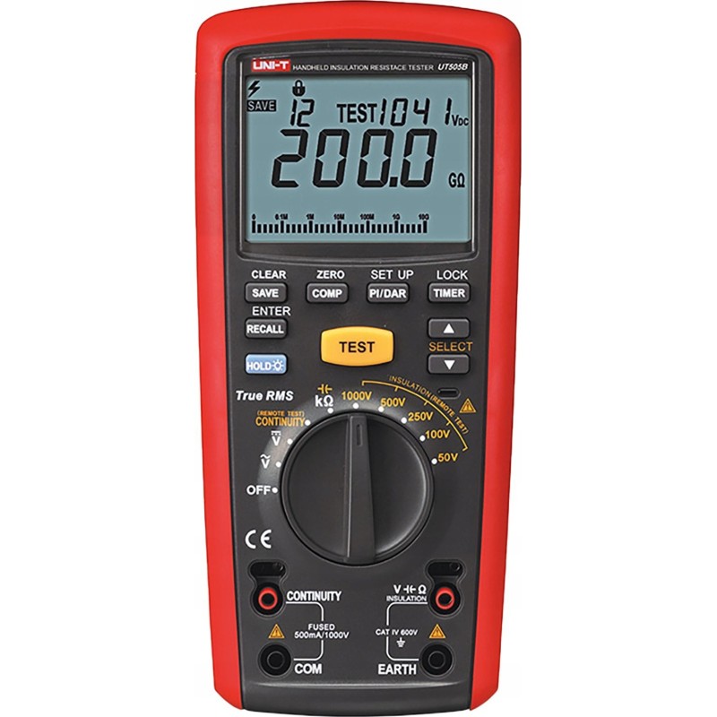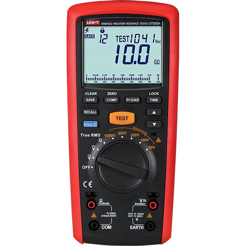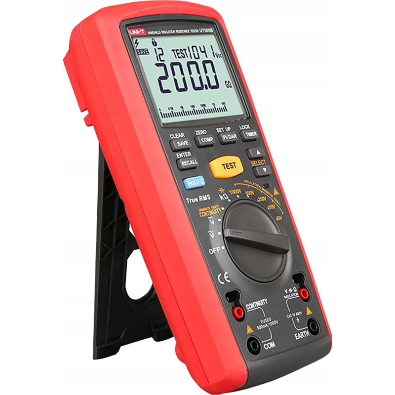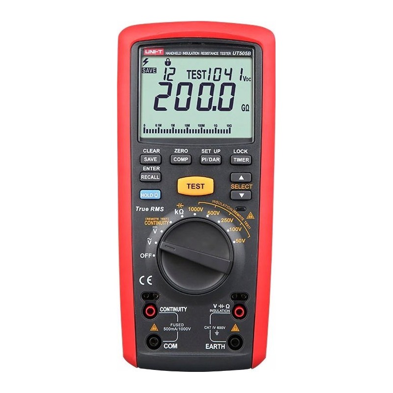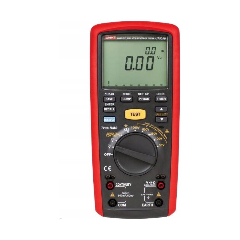 Das UT505B ist ein Messgerät, das die Funktionen eines Isolationswiderstandsmessgeräts und eines universellen Digitalmultimeters in sich vereint. Mit dem Isolationswiderstandsmessgerät (sog. Induktor) kann der Isolationswiderstand bis zu 200 GΩ gemessen werden. Die Prüfspannungen des UT505B können vom Benutzer während der Messung ausgewählt werden: 50 V, 100 V, 250 V, 500 V und 1000 V (1 kV). Das Isolationsmessgerät UT505B kann bei der Messung von Elektroinstallationen, der Überprüfung der Isolation in Transformatorwicklungen, Elektromotoren usw. eingesetzt werden, wo ein gewöhnliches Multimeter sicherlich nicht in der Lage ist, so hohe Isolationswerte zu messen. Das Isolationsmessgerät verfügt zusätzlich über eine Funktion zur Messung des Absorptionskoeffizienten DAR und des Polarisationsindex PI. Außerdem ist eine Funktion zur schrittweisen Änderung des Spannungswerts in 10-%-Schritten verfügbar.