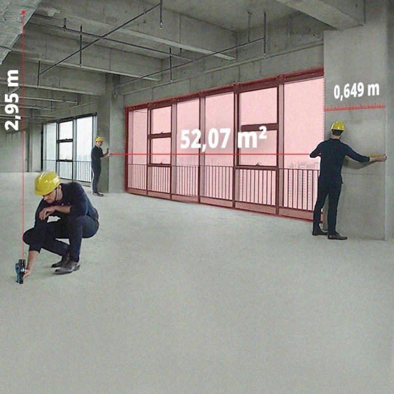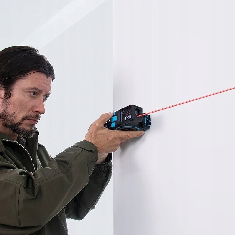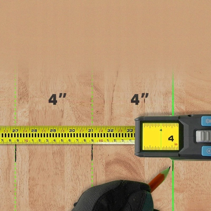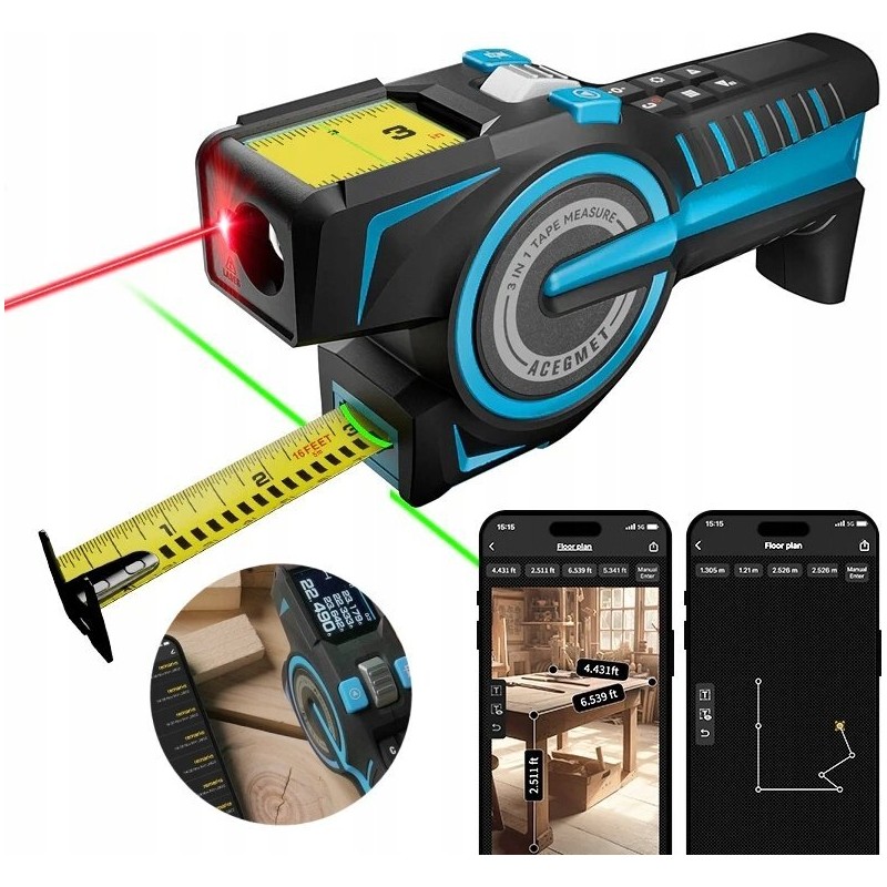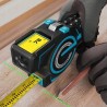 Es vereint ein digitales Maßband, einen Lasermesser und eine grüne Linie für präzises Markieren und Ausrichten.