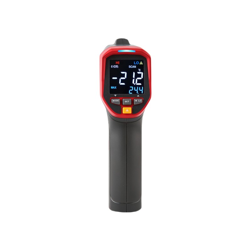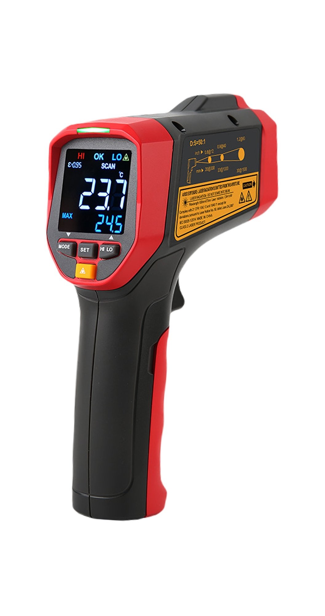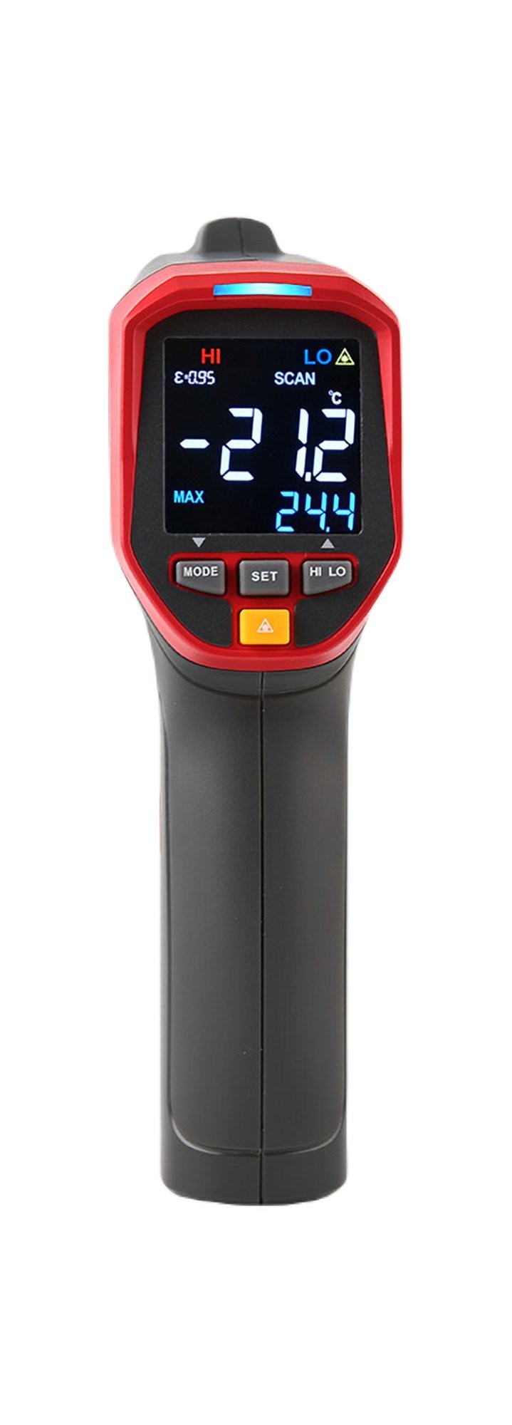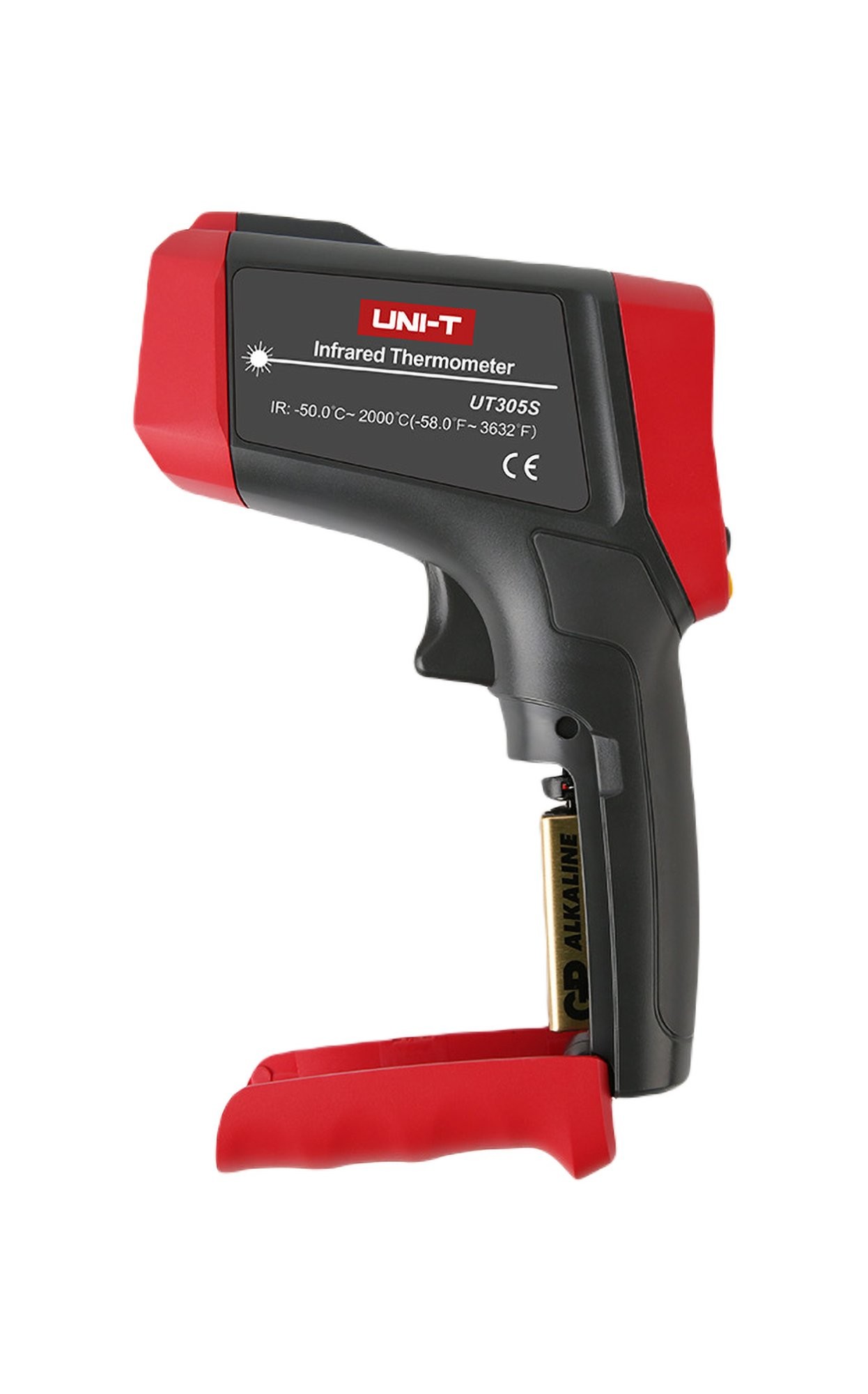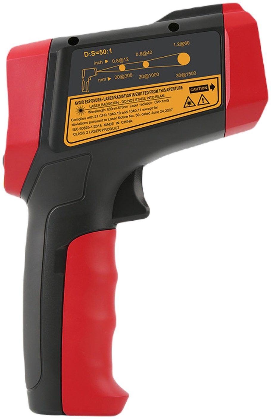 -----------TEMPERATURMESSUNG-----------Messbereich: -50 °C bis 2000 °C (-58 °F bis 3632 °F)Auflösung: 0,1 °CGenauigkeit: +/-1 °C (oder ±1 %)Wiederholgenauigkeit: 0,7 °C (oder 0,7 %)Reaktionszeit: <= 250 msSpektrale Empfindlichkeit: 8 µm ~ 14 µmD:S-Verhältnis: 50:1Emissionsgrad: 0,1 ~ 1,0Lasertyp: Klasse 2Laserleistung: <1 mWLaserwellenlänge: 630 nm ~ 670 nm-----------ZUSÄTZLICHE FUNKTIONEN-----------Alarm bei Grenzwertüberschreitung (akustisch und durch Farbwechsel der Hintergrundbeleuchtung)Einheitenauswahl: °C/°F Anzeige für niedrigen BatteriestandHintergrundbeleuchtung des Displays-----------ALLGEMEINE MERKMALE-----------Displaytyp: EBTN (35 x 35 mm)Stromversorgung: 9-V-Batterie (6F22) (nicht im Lieferumfang enthalten)Betriebstemperatur und -feuchtigkeit: 0 °C ~ 50 °C (32 °F ~ 122 °F); <90 % RHLagerungstemperatur und -feuchtigkeit: -20 °C ~ 60 °C (-4 °F ~ 140 °F); <85 % RHProduktabmessungen: 172 x 113,5 x 53 mmProduktgewicht (ohne Batterie): 310 g
