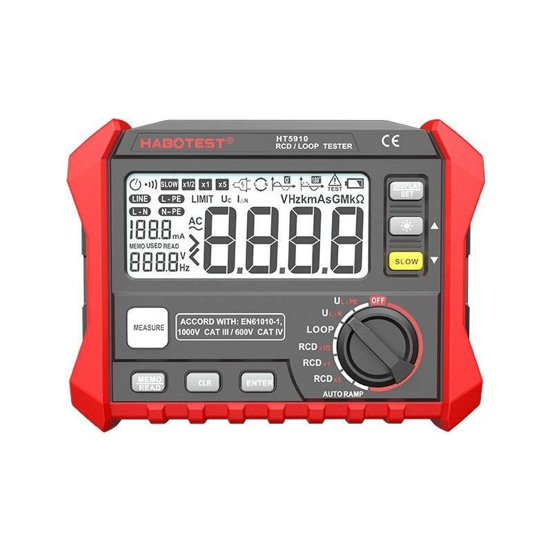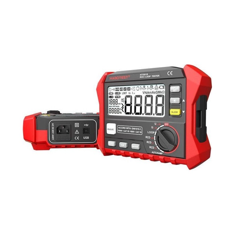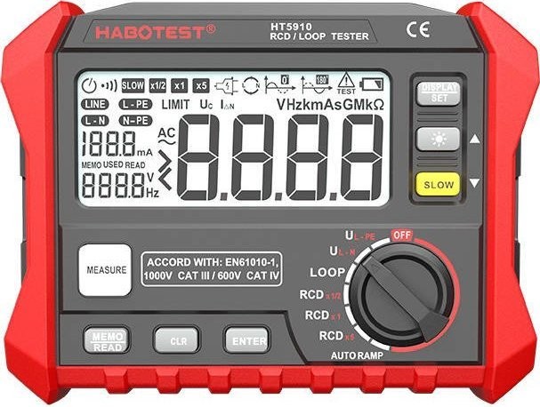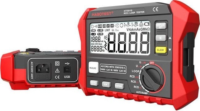 Erdungswiderstandsmessgerät Habotest HT5910 Das Erdungswiderstandsmessgerät Habotest HT5910 ist ein Gerät, mit dem Sie Erdungswiderstände messen können. Es bietet Messungen für Erdschleifen, FI-Schutzschalter und AUTORAMP. Es verfügt über ein gut lesbares LCD-Display, das Ihnen schnelle und übersichtliche Informationen zu den erfassten Daten liefert. Funktionalität steht an erster Stelle Mit Hilfe des Messgeräts erhalten Sie zuverlässig Informationen über den Erdungswiderstand. Sie haben Zugriff auf 100 Speicherplätze, in denen die Daten der durchgeführten Messungen gespeichert werden. Das Gerät ist mit einem speziellen Drehknopf ausgestattet, mit dem Sie die gewünschte Messart auswählen und das Gerät mit der Taste „Measure“ starten können. Benutzerfreundlichkeit Das HT5910 verfügt über ein gut lesbares LCD-Display, auf dem alle erfassten Daten angezeigt werden. So haben Sie auch in schwach oder stark beleuchteten Umgebungen sofortigen Zugriff auf die durchgeführten Messungen. Das Messgerät wird mit 6 AA-Batterien betrieben, die separat erworben werden müssen. Technische Daten: Hersteller Habotest Modell HT5910 Ansprechzeit 1 x IΔ N300 (500 ms), 5 x IΔ N40 ms (150 ms) (±3 ms) Auslösestrom (0,2–1,1) IΔN (±0,1 IΔN) Kontakt-Spannung 0–99,9 V (±10 % + 0,2 V) Wechselspannung 0–440 V (±3 % + 3 V) Frequenz DC, 45–65 Hz (±1 Hz) Schleifenimpedanz 0,1–2000 Ω (±10 % + 0,2 Ω) RL-Stromtest 0,51 IΔN (±10 % + 10 Ω) Messmultiplikator x0,5, x1, x5 Stromstärke (IΔN) 10 mA, 30 mA, 100 mA, 300 mA, 500 mA Phasenwinkel 0° oder 180° Stromversorgung 6 x AA-Batterie 1,5 V (nicht im Lieferumfang enthalten) Abmessungen 180 x 140 x 65 mm Gewicht ca. 95 g Sicherheitsklasse EN61010-1 / CAT.III 600 V Datenspeicher 100 Gruppen Schnittstelle USB 2.0 EAN: 5907489608961 Garantie: Garantiezeit Hersteller-Code: HT5910