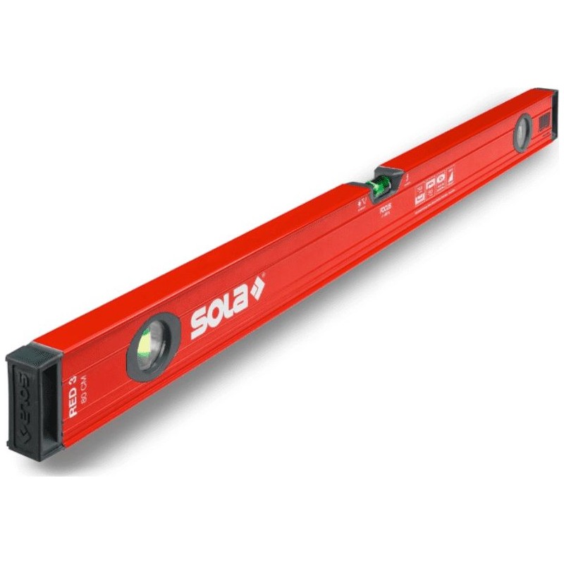 Eine professionelle Wasserwaage aus der RED 3-Serie des österreichischen Unternehmens Sola – einem der weltweit führenden Hersteller von Messwerkzeugen. Es handelt sich um ein präzises, hochwertiges Werkzeug, das für den professionellen Einsatz empfohlen wird und die Erwartungen anspruchsvoller Anwender erfüllt. Die RED 3-Serie eignet sich für allgemeine Bauarbeiten, Montagearbeiten, Sanitärarbeiten usw. Sie zeichnet sich durch ein besonders stabiles Profil aus. Sie verfügt über 3 Libellen, 2 zur Höhenmessung und eine zur Nivellierung.