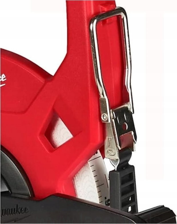 Milwaukee-Maßband im offenen Gehäuse. Das Band ist beidseitig bedruckt – die metrische Skala befindet sich auf der Oberseite, die Zollskala auf der Unterseite. Dank des Glasfaserbandes ist das Maßband sehr leicht. Das 3:1-Getriebe sorgt für ein sanftes und schnelles Aufrollen sowie eine bis zu 10-mal längere Lebensdauer. Das Gehäuse verfügt über einen Mechanismus, der das Maßband sauber hält und verhindert, dass Schmutz in das Getriebe gelangt.