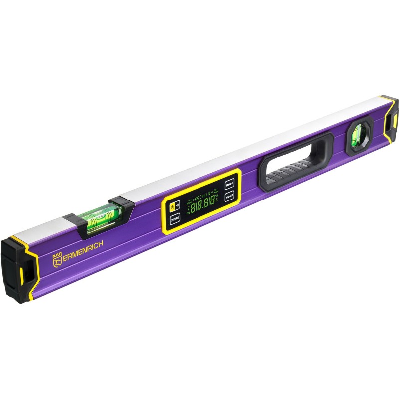Die Wasserwaage ist mit mehreren nützlichen Funktionen ausgestattet – einem akustischen Signal, einer Haltefunktion, mit der die Anzeigen auf dem LCD-Display „eingefroren“ werden können, sowie einer Nullstellungsfunktion zur Bestimmung relativer Winkel. Die digitale Wasserwaage kann auch als herkömmliche Libellenwasserwaage verwendet werden – es stehen 2 integrierte Libellen zur Verfügung. Das Gerät Ermenrich Verk LL60 wird mit 2 AAA-Batterien betrieben. Um Energie zu sparen, ist das Gerät mit einer automatischen Abschaltfunktion ausgestattet, die nach 3 Minuten Inaktivität aktiviert wird. Das robuste Aluminiumgehäuse ist spritzwasser- und staubgeschützt (Schutzklasse IP54). Der magnetische V-Groove-Fuß erleichtert die Ausrichtung der Wasserwaage auf Metalloberflächen und anderen Materialien.