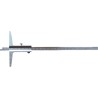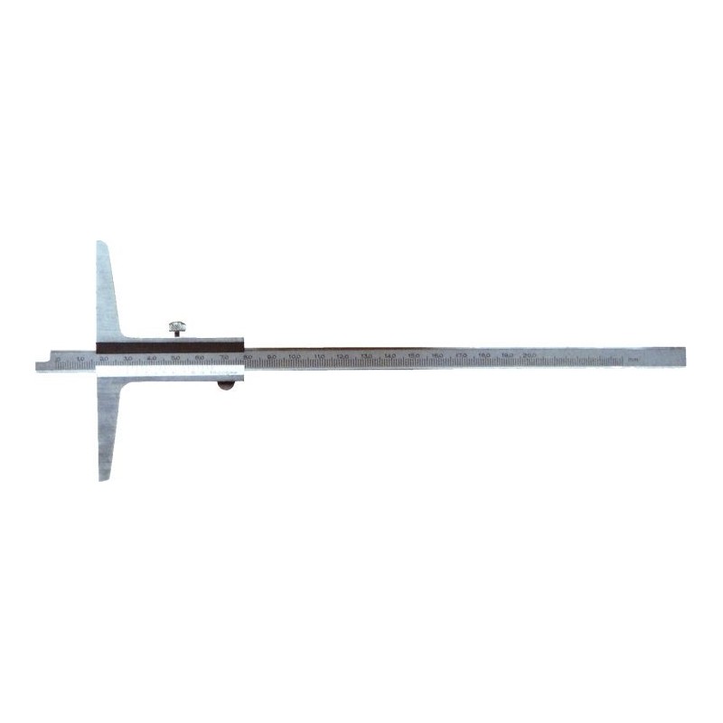 Tiefenmessgerät mit einer Länge von 200 mm und einer Basis von 100 mm, aus Edelstahl gefertigt. Es verfügt über eine Skala und einen Nonius mit satiniertem Chromfinish, was eine hohe Messgenauigkeit gewährleistet. Die Genauigkeit beträgt 0,05 mm gemäß DIN 862.