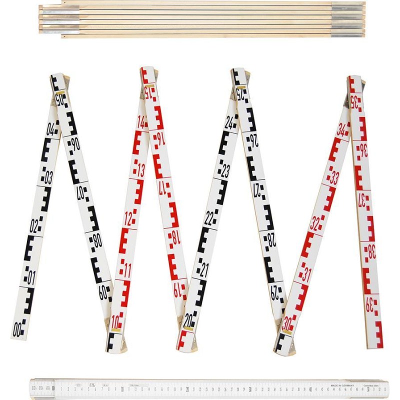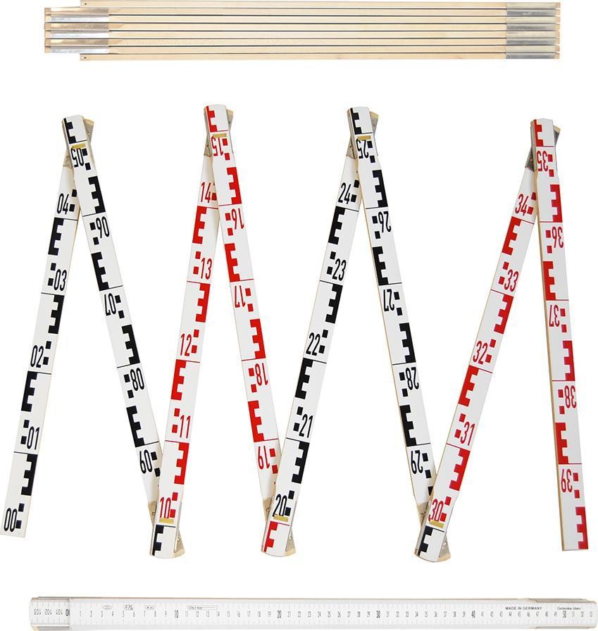 Zusammenklappbarer Holz-Maßstab RICHTER 6991 mit einer Länge von 4 m / 8 Elementen, auf der einen Seite mit geodätischer E-Skala und auf der anderen Seite mit Millimeterskala. Die Maßstäbe bestehen aus Buchenholz und hochwertigen Stahlbeschlägen. Solide, robuste Federn aus verzinktem Metall garantieren eine lange Lebensdauer und sorgen für hohe Messgenauigkeit. Die Messlatte ist an beiden Enden mit Endkappen versehen und mit einem dauerhaften, witterungsbeständigen Lack beschichtet. Im zusammengeklappten Zustand sehr handlich aufgrund seiner geringen Größe. Anwendungsbereiche: Bauwesen, Versicherungsgesellschaften (als Messlatte für Gutachter), Vermessungswesen, Hausrenovierungen. Technische Daten Genauigkeitsklasse: III Länge: 4 m Anzahl der Elemente: 8 Querschnitt 1 Element: 30 x 6,5 mm Breite im zusammengeklappten Zustand: 6 cm Länge im zusammengeklappten Zustand: 58 cm Farbe: weiß Beidseitige Skalierung: Vermessungsskala E/cm-mm Fragen Sie nach größeren Mengen unter Tel. 56 306 61 00