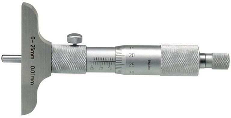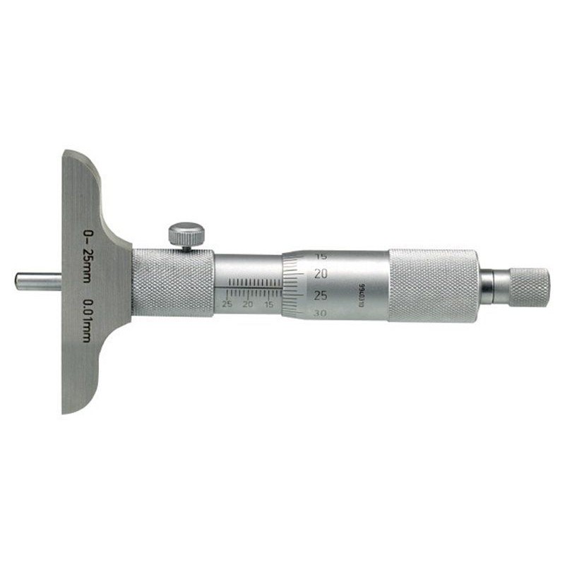 Ablesegenauigkeit 0,01 mm, mit austauschbaren Messspitzen, deren Länge in 25-mm-Schritten zunimmt. Mikrometerkopf matt verchromt nach DIN 863
