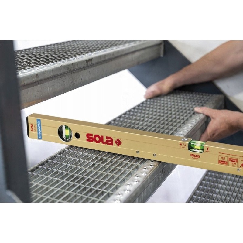Die aus eloxiertem Aluminium gefertigte Wasserwaage Sola AZM zeichnet sich nicht nur durch ihre elegante goldene Farbe aus, sondern auch durch eine hohe Widerstandsfähigkeit gegen Beschädigungen. Ihre robuste Konstruktion garantiert eine lange Lebensdauer, was sie zum idealen Werkzeug für den intensiven Einsatz macht.
