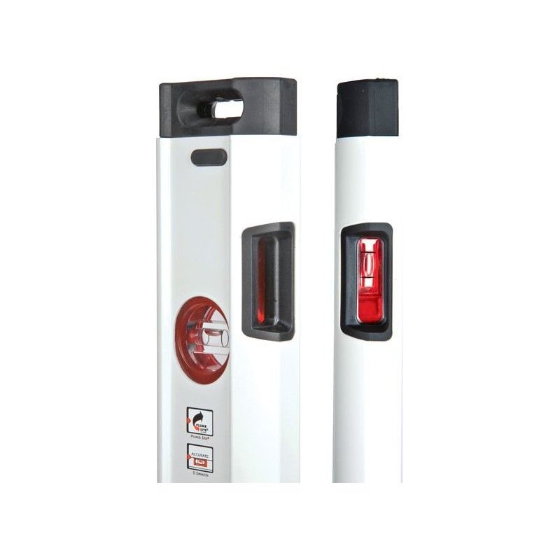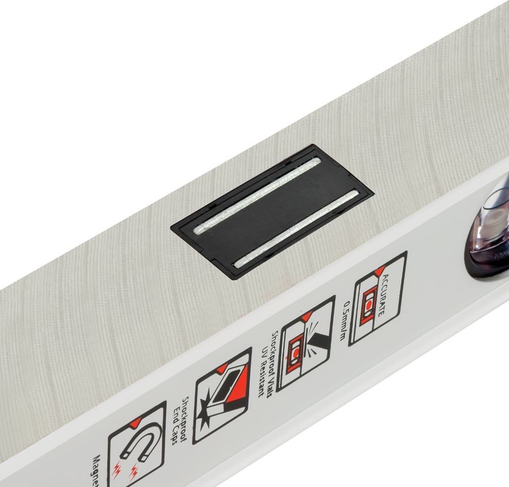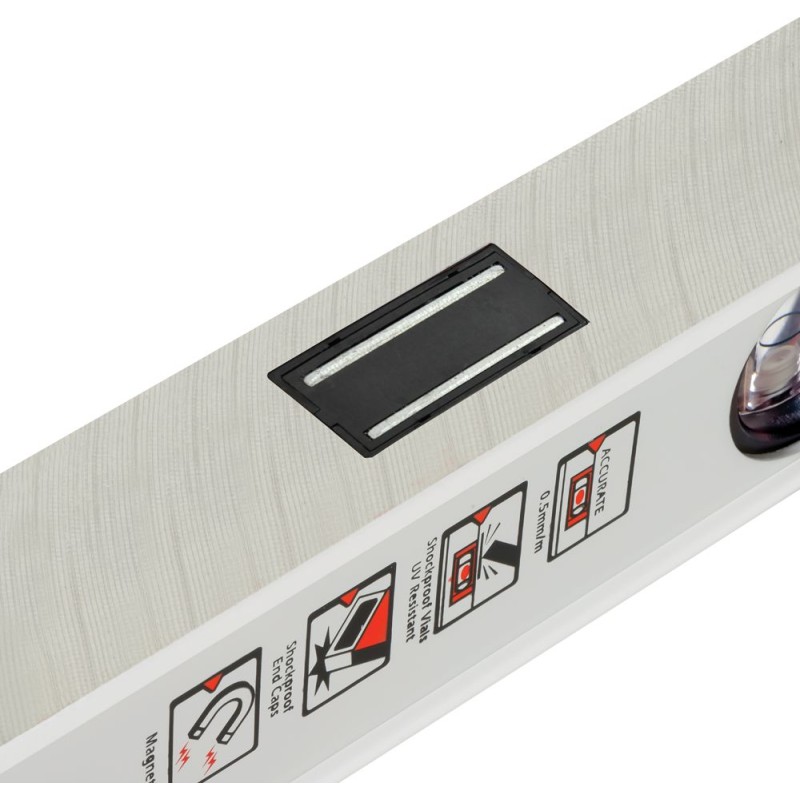 • Verstärktes Profil mit Steg im horizontalen Libellenkörper für erhöhte Festigkeit und dauerhafte Kantenmarkierung