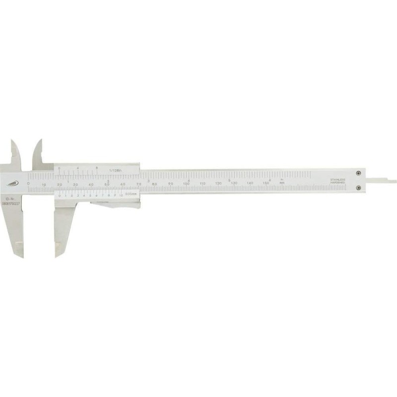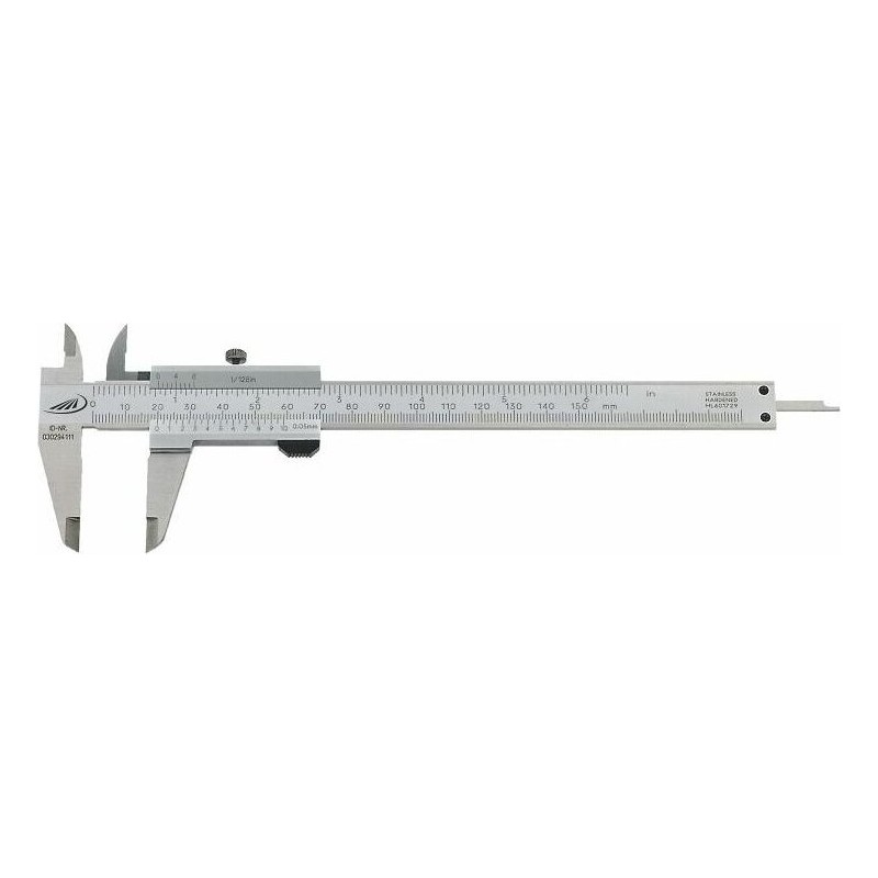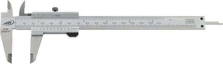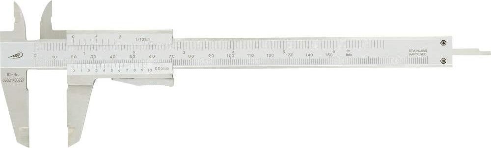 Der Messschieber hat einen Messbereich von bis zu 200 mm und wird in einem Etui aus Kunstleder geliefert.
