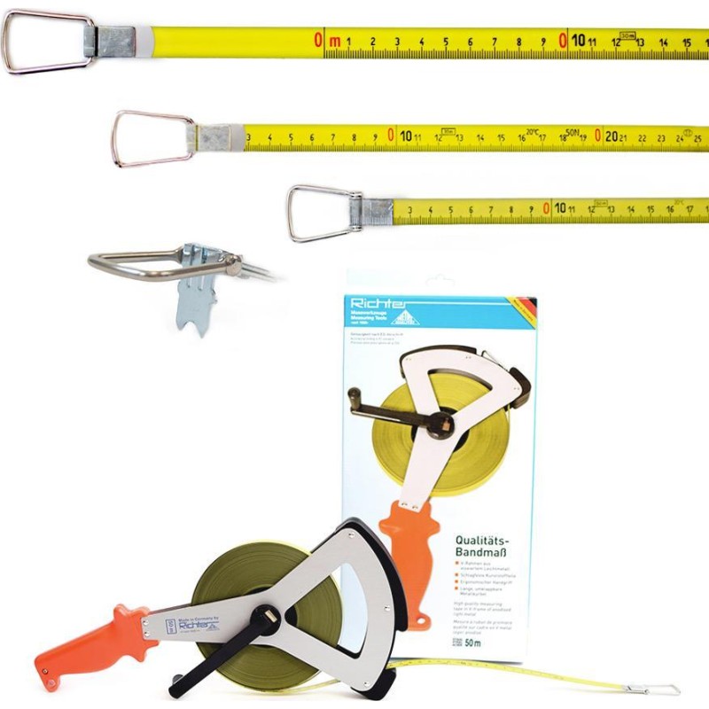 Stahlband der deutschen Firma RICHTER, Typ 404V, 50 m, hergestellt aus einer bruchsicheren und korrosionsbeständigen Stahllegierung, beschichtet mit einer dicken Polyamidschicht. Der Stahl ist zum Schutz vor Korrosion mit Teflon beschichtet. Das Maßband verfügt über einen ergonomischen Griff aus hochwertigem Kunststoff, der für einen sicheren Halt in der Hand sorgt. Eine klappbare Stahlkurbel erleichtert das schnelle Aufrollen, die Konstruktion ist vernietet und schlagfest. Der Rahmen des Maßbands besteht aus einer leichten Aluminiumlegierung. Technische Daten Länge: 50 m Material: Stahl mit Polyamidbeschichtung, Bandbreite: 13 mm Skalenhintergrund: gelb Skala: Millimeter, schwarz Skalenwerte: schwarz und rot Das Maßband entspricht den EU-Normen der Genauigkeitsklasse II (+/- 2,3 mm auf 10 m). Fragen Sie nach größeren Mengen unter Tel. 32 428 11 32