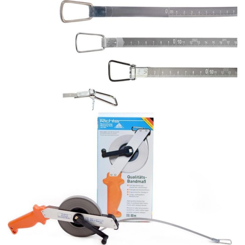 Stahlbandmaß der deutschen Firma RICHTER 464SR, 50 m, aus bruchsicherer und korrosionsbeständiger Stahllegierung. Die Skala ist in den Stahl eingraviert. Das Maßband verfügt über einen ergonomischen Griff aus hochwertigem Kunststoff, der für einen sicheren Halt in der Hand sorgt. Ein klappbarer Stahlkurbelgriff erleichtert das schnelle Aufrollen, die Konstruktion ist vernietet und stoßfest. Der Rahmen des Maßbands besteht aus einer leichten Aluminiumlegierung. Technische Daten Länge: 50 m Material: geätztes Stahlband Bandbreite: 13 mm, Skalenuntergrund: silberfarben Skala: Millimeterskala, geätzt, Skalenwert: silberfarben, geätzt. Das Maßband entspricht den EU-Normen der Genauigkeitsklasse II (+/- 2,3 mm auf 10 m). Fragen Sie nach größeren Mengen unter Tel. 56 306 61 00