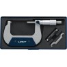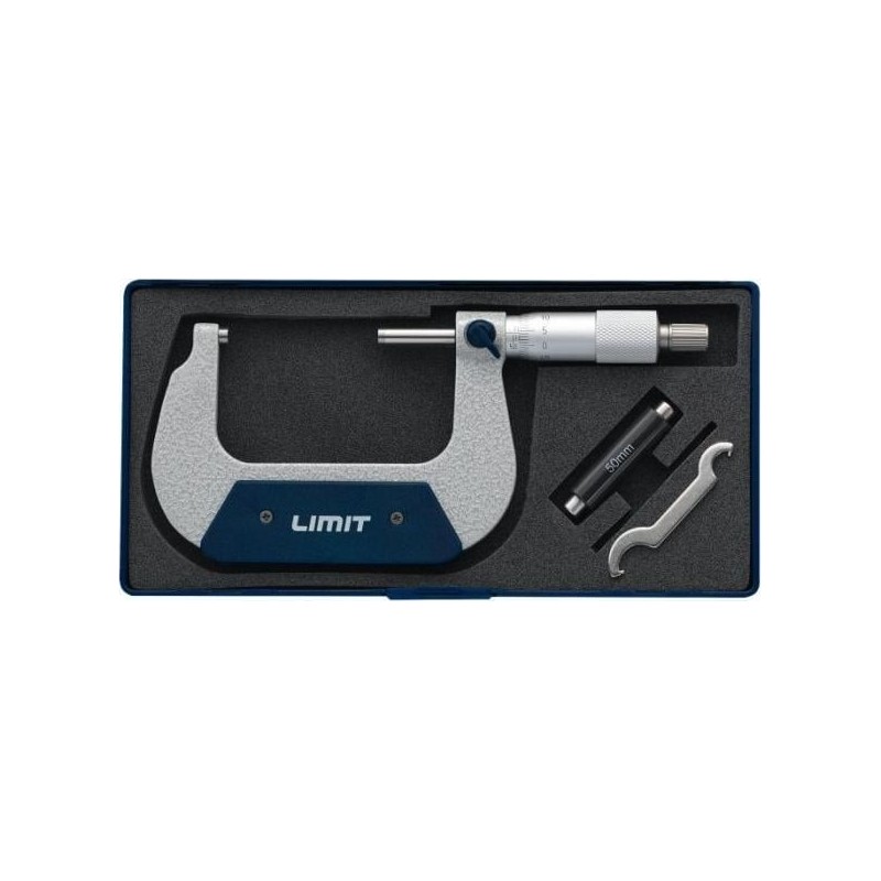 Mikrometer mit geschmiedetem Bügel und mattverchromter Skala, bestimmt für Außenmessungen. Gehärtete Spindel mit einem Durchmesser von 6,5 mm und präzise geläppten Messflächen aus Hartmetall. Mit Hülse mit Reibungskupplung und Feststellhebel. Ausführung gemäß DIN 863....