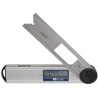 Elektronischer Winkelmesser mit digitaler Anzeige. Auf der Oberseite befindet sich eine Libelle. Display mit großen Ziffern. Das Display kann in jeder Position auf Null gestellt und auf absolute Werte umgeschaltet werden. Hold-Taste zum Einfrieren des aktuellen Messwerts auf dem Display. Beweglicher Arm, der mit einem Klemmknopf arretiert wird, der an jede beliebige Stelle verschoben werden kann.